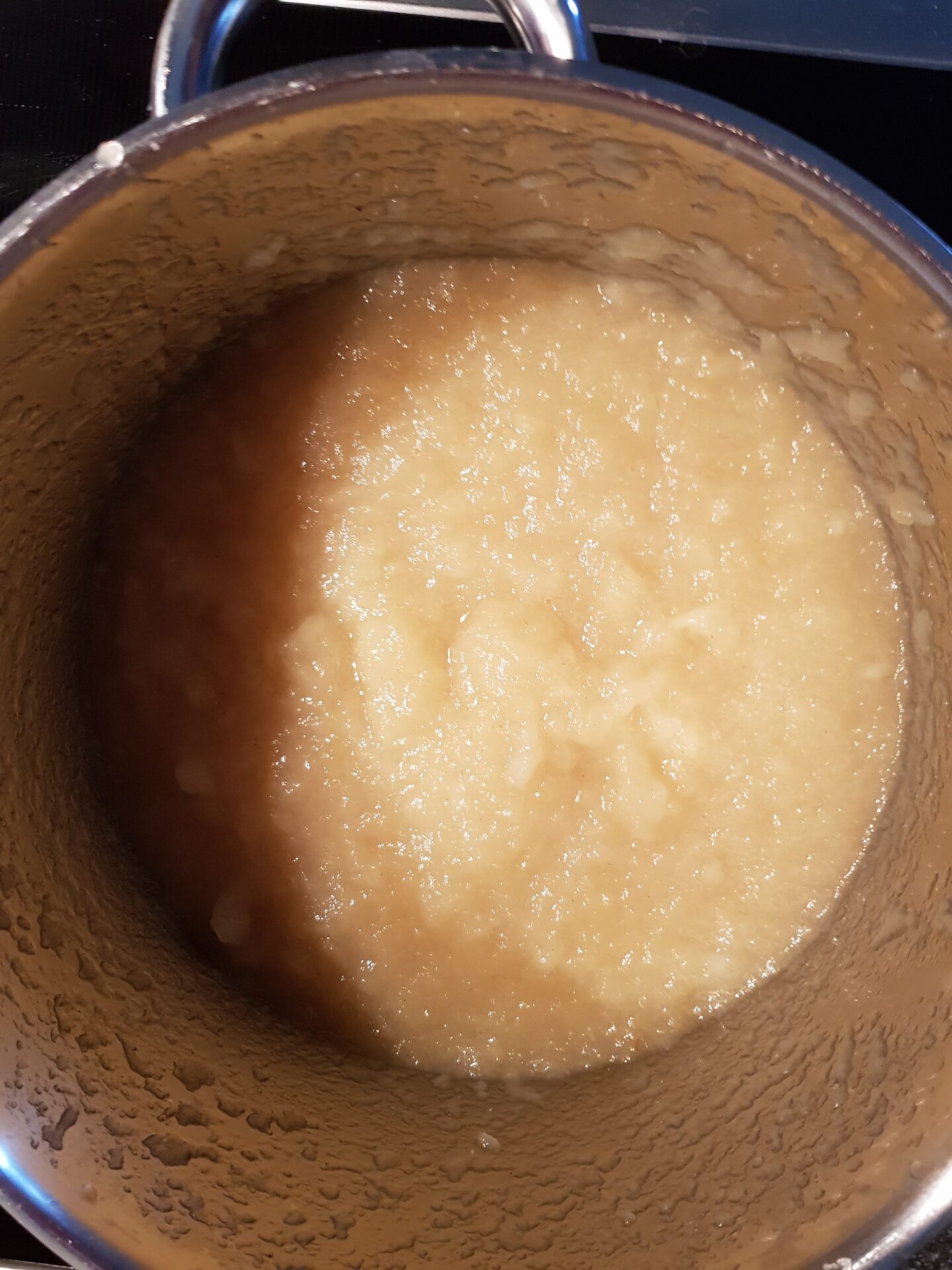 Da ich mein Apfelmus selber mache brauche ich noch 6 Äpfel mehr. Diese schäle ich, schneide sie in kleine Stücke und stelle sie mit wenig Wasser bei kleiner Hitze auf den Herd. Dazu kommt nach Geschmack Zucker und etwas Zimt, dann Alles 15 Minuten köcheln lassen, pürieren und kaltstellen.