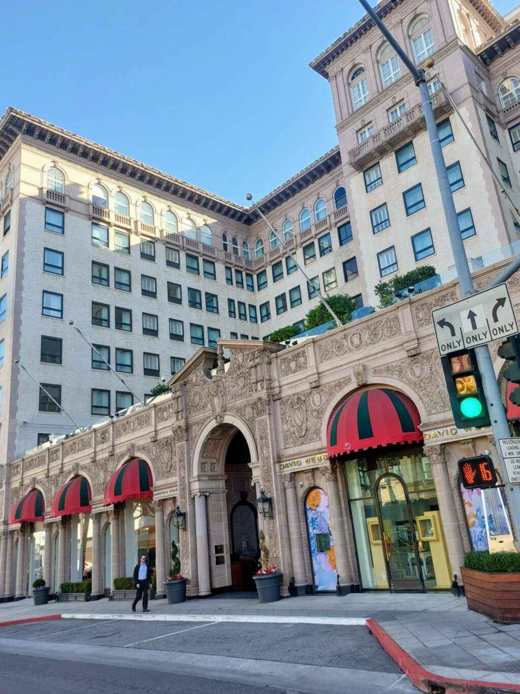 Das Hotel besteht aus zwei miteinander verbundenen Gebäuden – dem ursprünglichen historischen Teil und einem rund zehnstöckigen Neubau. Beide sind durch eine elegante Brücke im zweiten Stock verbunden. Sobald man durch die Lobby tritt, steht man direkt am berühmten Rodeo Drive, eine der bekanntesten Einkaufsstraßen der Welt. Und während man noch den Blick über die edlen Schaufenster schweifen lässt, spürt man: Hier ist jeder Schritt ein kleines bisschen Kinomagie.