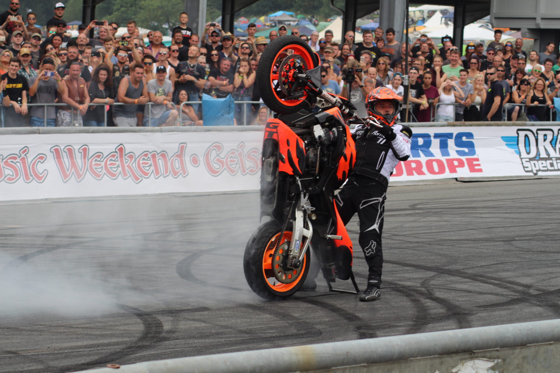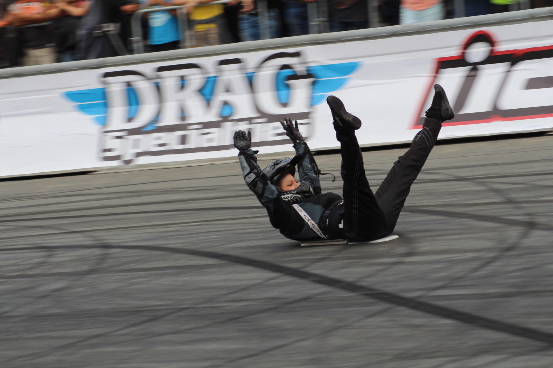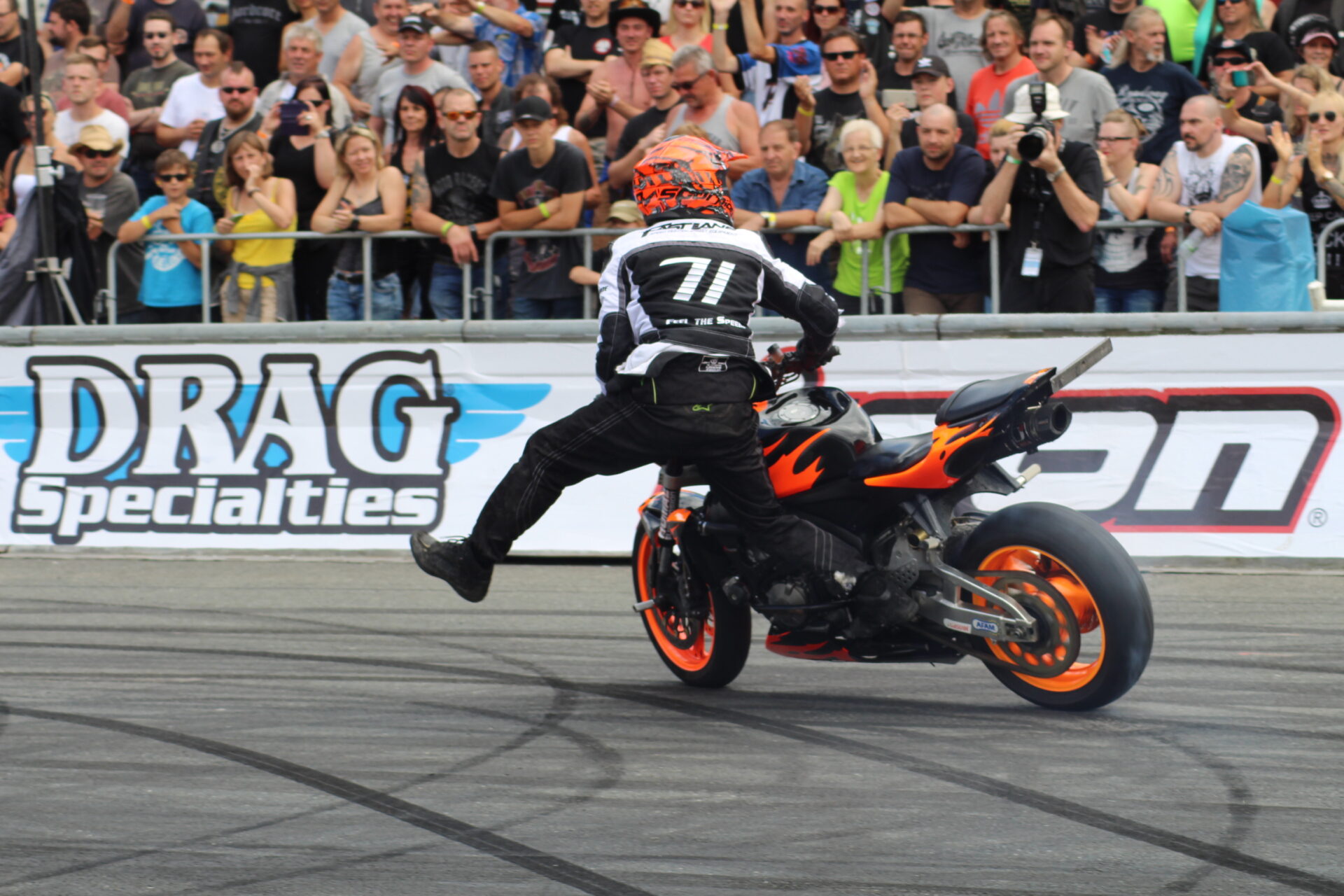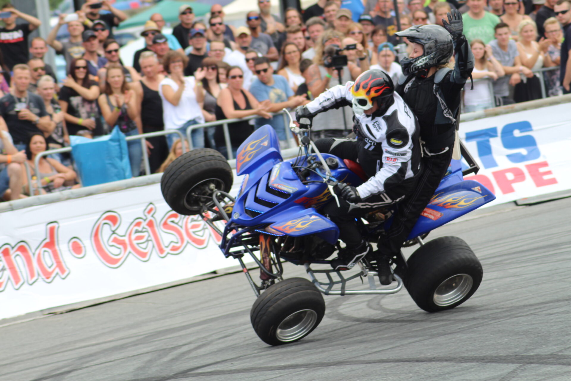 Vor allem die Nummer, mit dem Quad eine Frau auf einer Art Skateboard kräftig anzuschieben, war sensationell. Bei den Burnout Wettbewerben gab es dann richtig Gummi und Qualm bis der Reifen geplatzt ist.