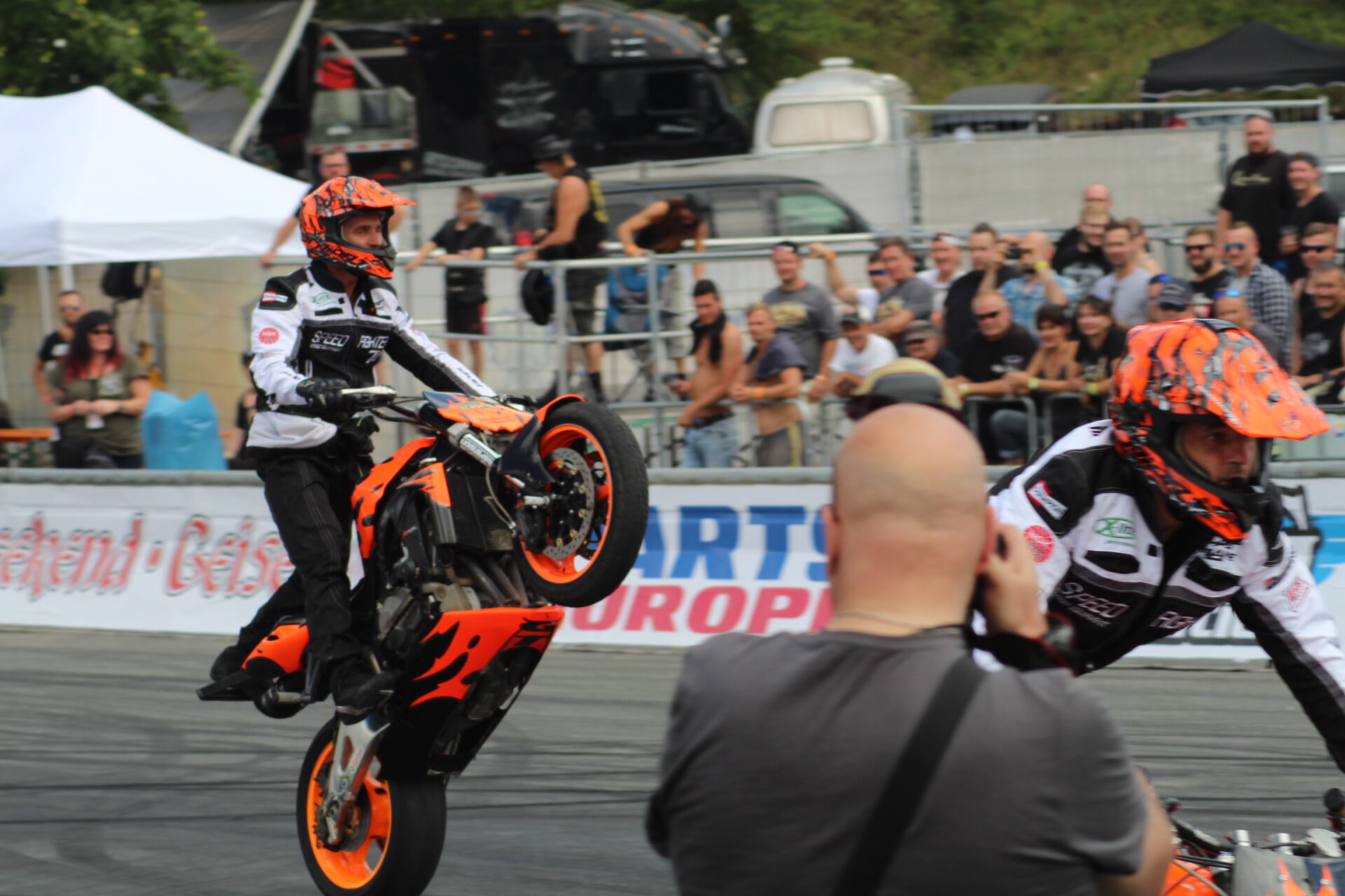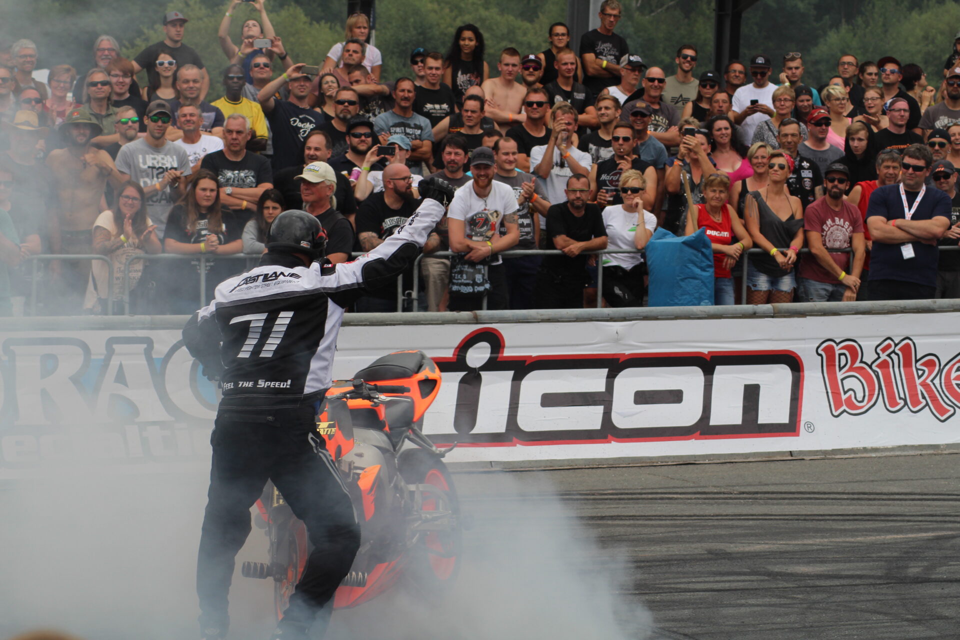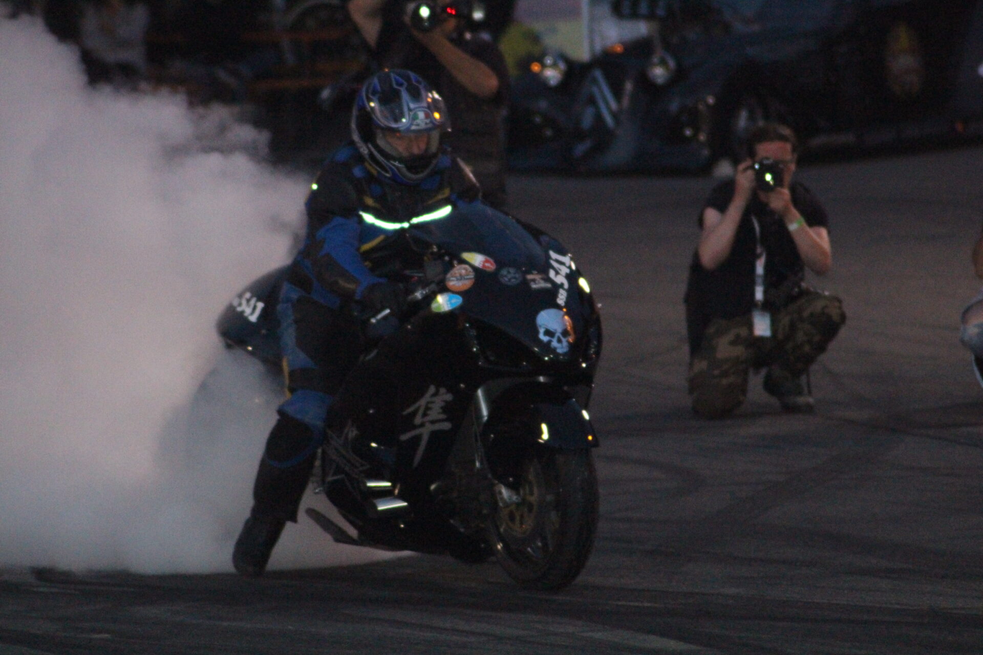 Vor allem die Nummer, mit dem Quad eine Frau auf einer Art Skateboard kräftig anzuschieben, war sensationell. Bei den Burnout Wettbewerben gab es dann richtig Gummi und Qualm bis der Reifen geplatzt ist.