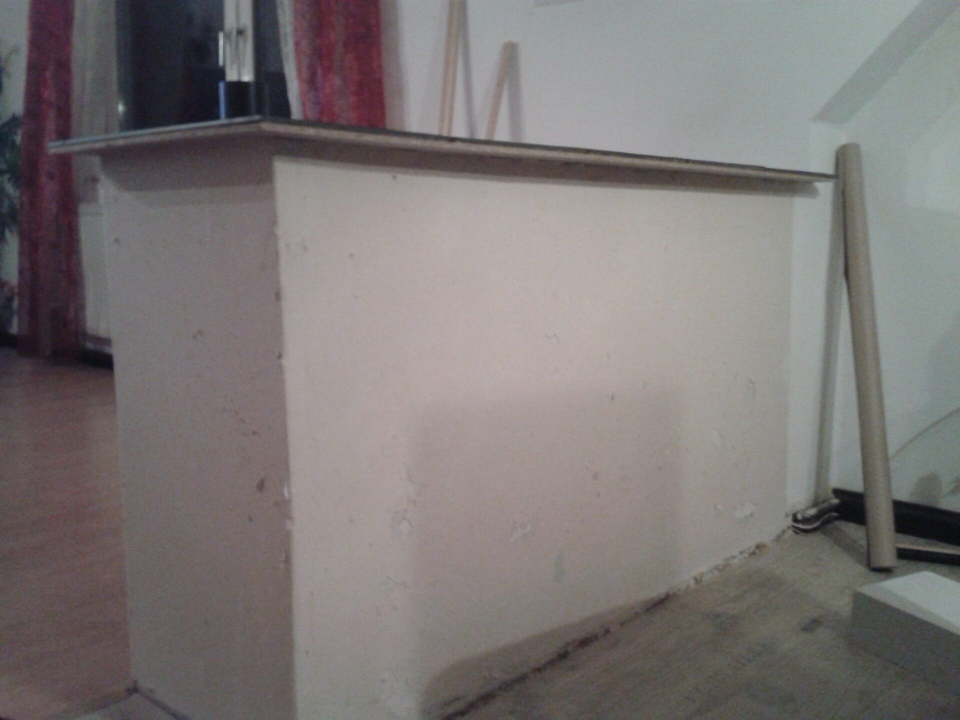 Bei uns im Wohnzimmer steht ein Raumteiler, der durch einen Mauerdurchbruch entstanden ist. Da er mit der Außenwand verbunden ist und für Stabilität sorgt, fand Klaus es sicherer ihn nicht abzureißen. Jetzt war die Frage, was machen wir aus einem Raumteiler, der aus einer halben Mauer bestand mit einer Holzplatte darauf? Bislang diente er als Ablage für dies und das. Nun kam uns der Gedanke ihn zu einer kleinen Hausbar zu machen. Als Erstes sollte die Mauer aufgehübscht. Klaus entschied sich für Buntsteinputz .