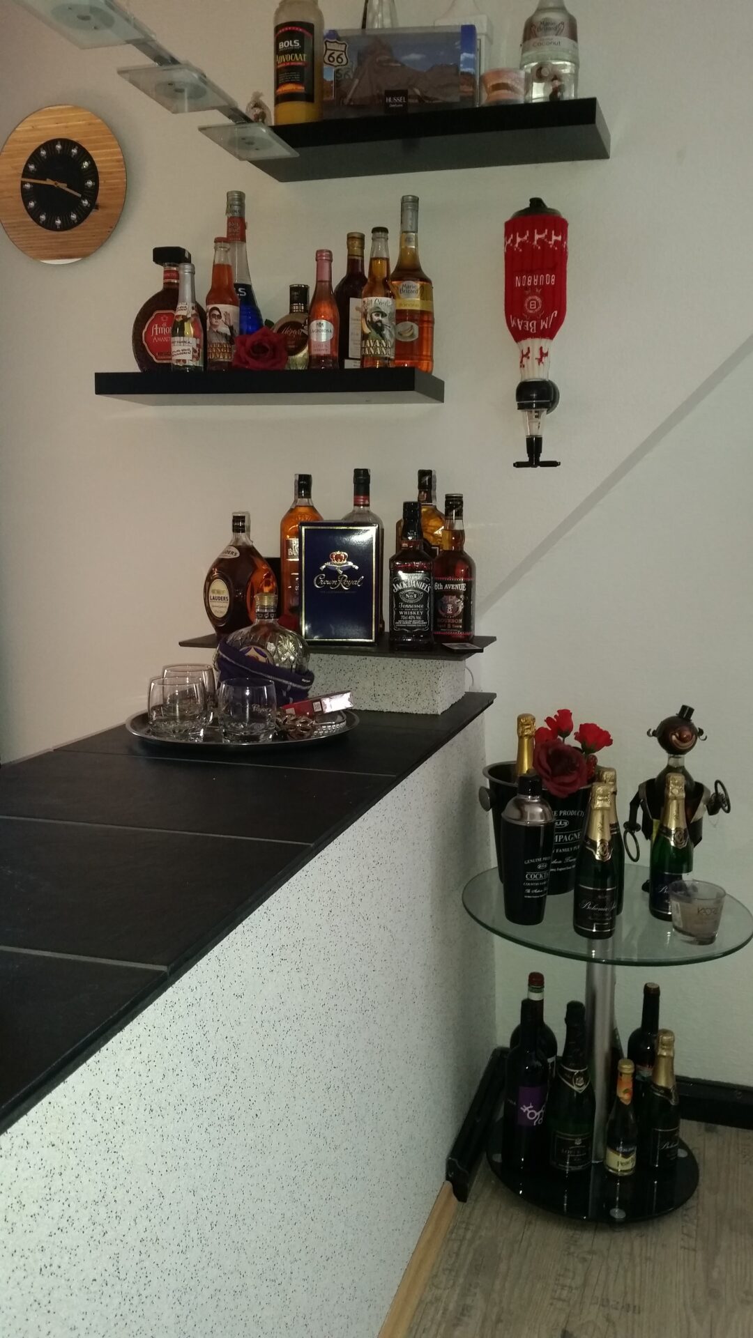 Nachdem die Wand mit Buntsteinputz für den Raumteiler bearbeitet war, wurde auf die Oberfläche der Mauer eine Pressspanplatte geschraubt, die natürlich ganz genau in der Waage sein mußte, weil darauf Fliesen verlegt werden sollten. Diese wurden einfach mit Silikon befestigt und verfugt. Am unteren Rand der Fliesen wurde eine LED Lichtleiste angebracht, natürlich mit Farbwechsler zur jeweiligen Stimmung. Auf der hinteren Seite ein mit Buntsteinputz verputzter Ytongstein, darauf eine Fliese und schon hatte Klaus einen Platz für seine Whiskys. Dann noch Regale an die Wand für einige andere Spirituosen und zwei Barhocker zum Hinsetzen. Fertig war unsere kleine Hausbar.