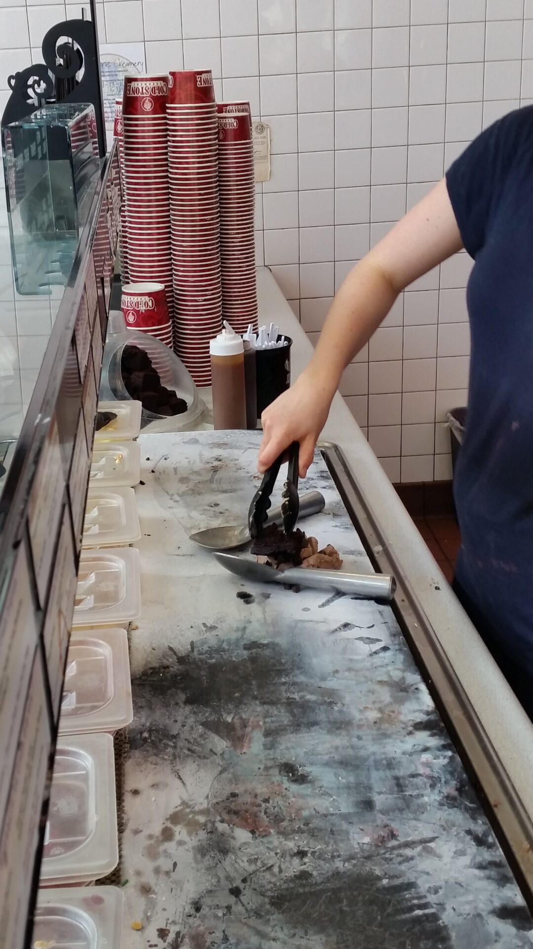 Mit zwei Eisspachtel wird nun das ganze bearbeitet. Es wird auf den Cold Stone gedrückt, die Smarties dazugegeben und gehackt und gemischt. Danach wird es mit Schokosoße übergossen, weiter vermischt und kommt dann in eine Waffel oder einen Becher.