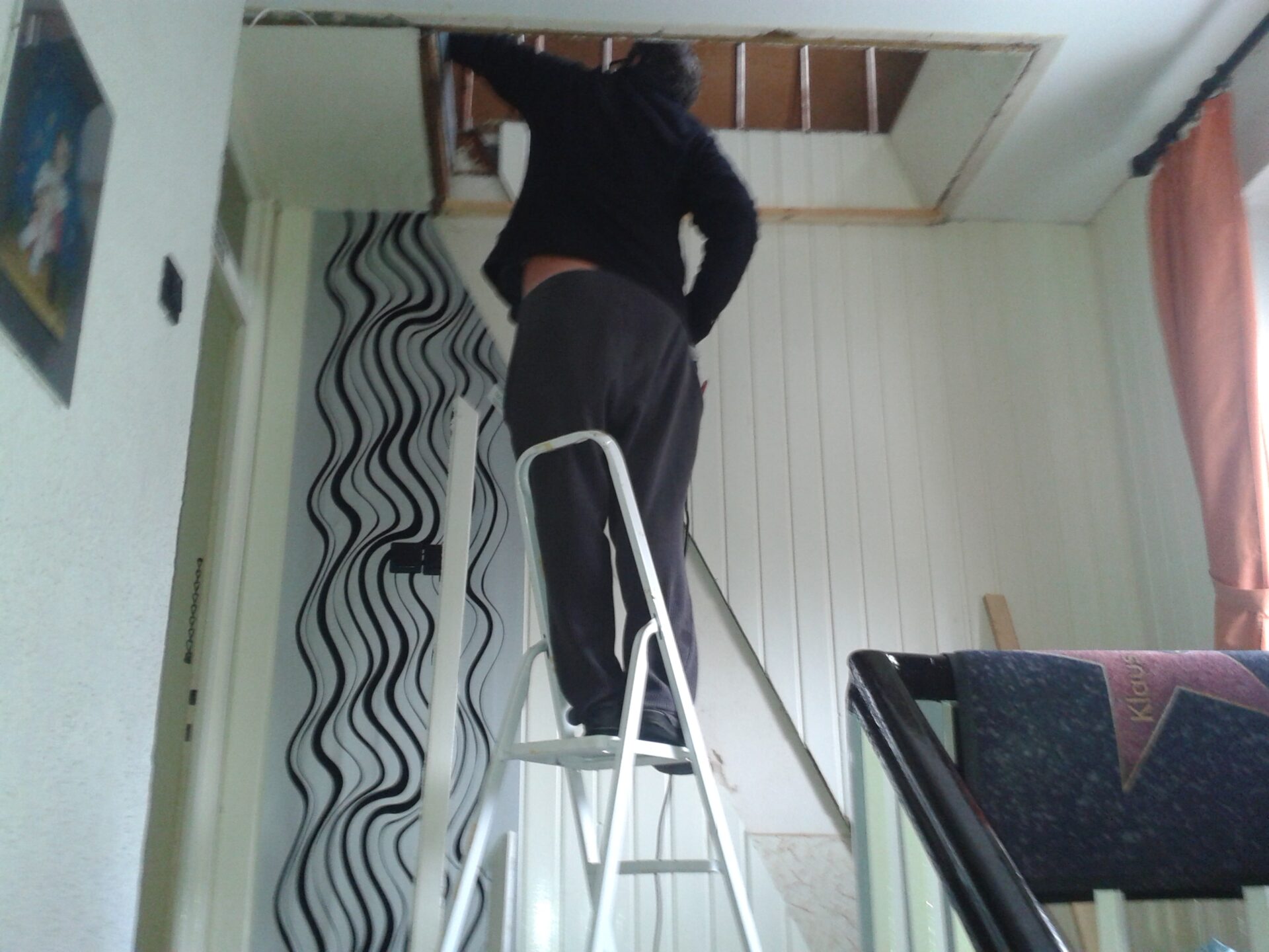 Da wir unseren Dachboden nur als Abstell- oder Lagerraum nutzen, wollte ich an Stelle unserer feststehende Bodentreppe eine neue platzsparende Dachbodentreppe einbauen. Diese neue, ausklappbare Dachbodentreppe wird mit einem dazugehörigen Stab geöffnet, die Treppe klappt aus und später, wenn wir sie nicht mehr brauchen, verschwindet sie wieder nach oben und ich kann den Platz darunter nützen wie ich möchte.
