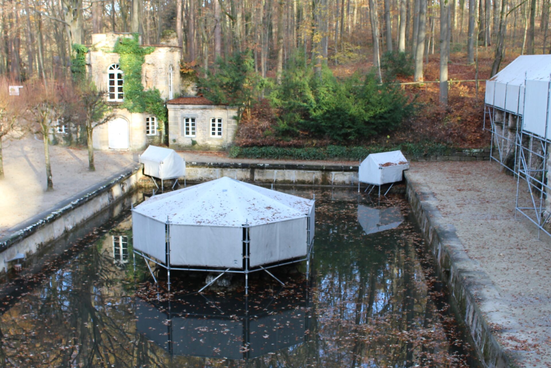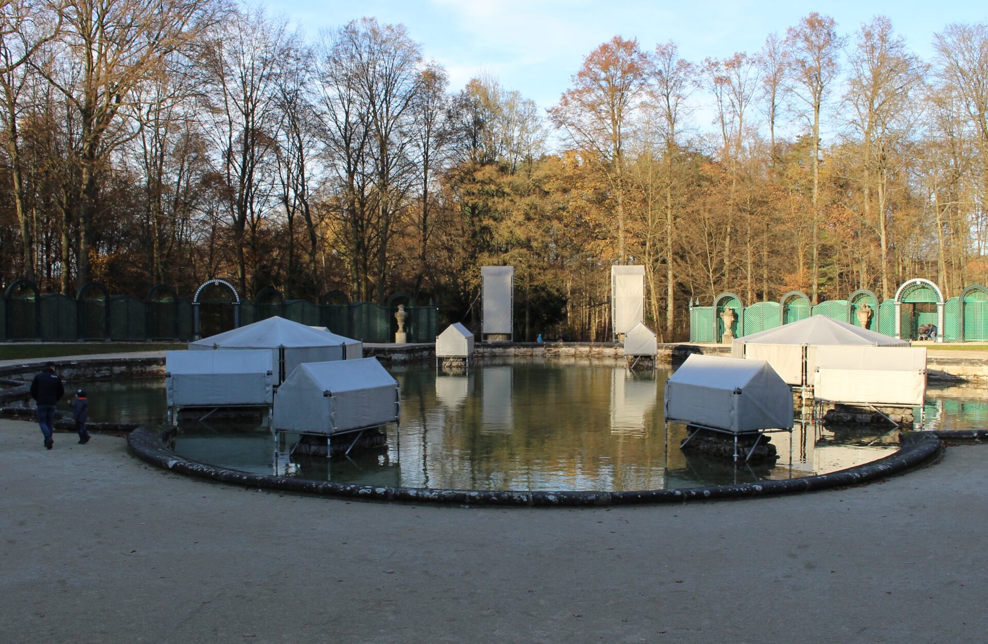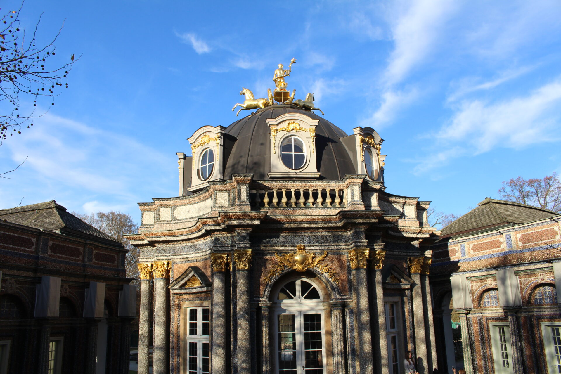 Im einem Flügel befindet sich für die Gäste der Eremitage ein liebenswertes Cafe. Dort kann man bei Kaffee und Kuchen die Gedanken schweifen lassen. Vielleicht denkt man an die Zeit als Markgräfin Wilhelmine hier durch die Gärten wandelte. Oder man genießt einfach nur den wunderbaren Ausblick auf den großen Brunnen. In diesem finden im Sommer regelmäßig Wasserspiele statt. Leider waren die Figuren schon mit Schutzplanen vor dem Winter geschützt.