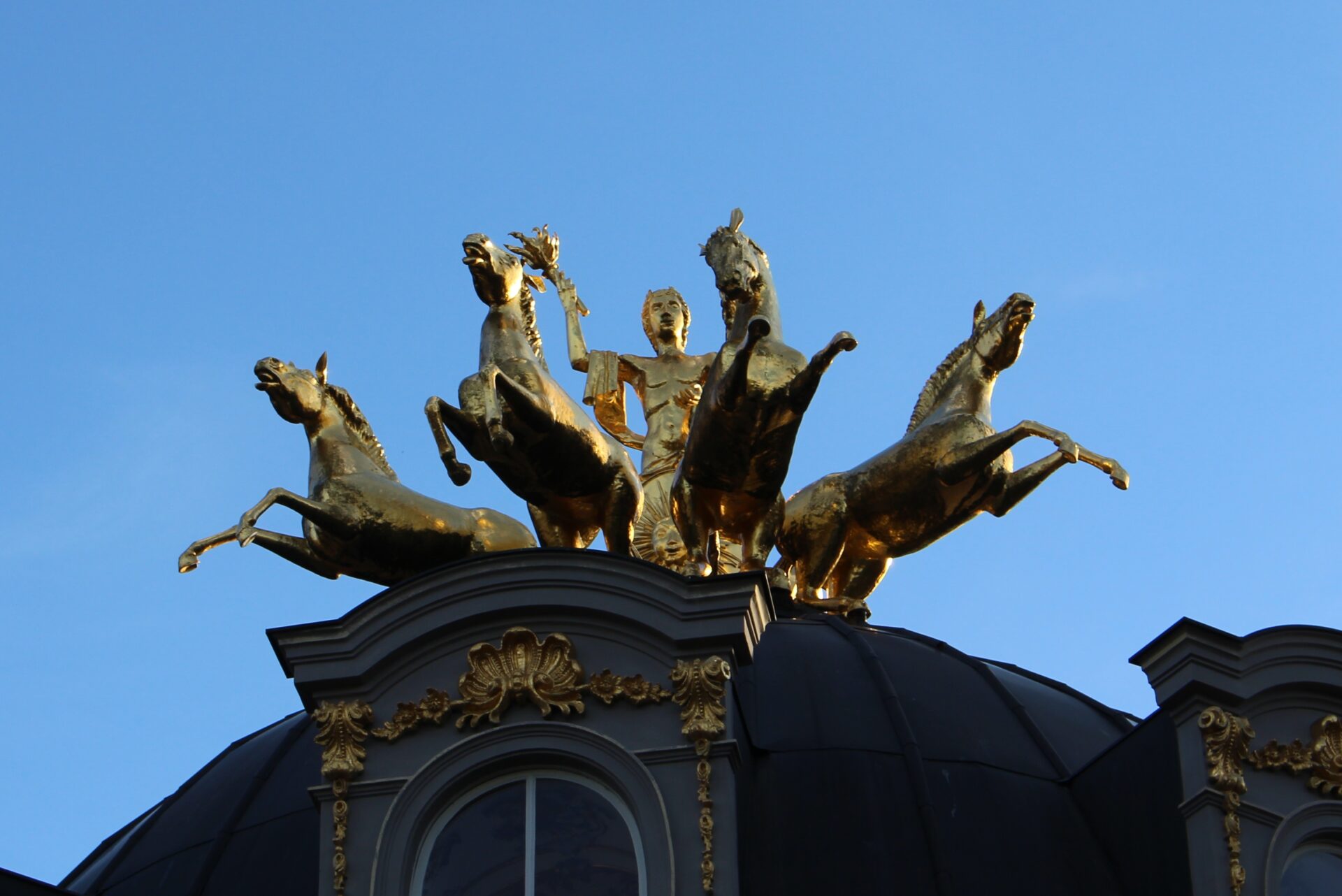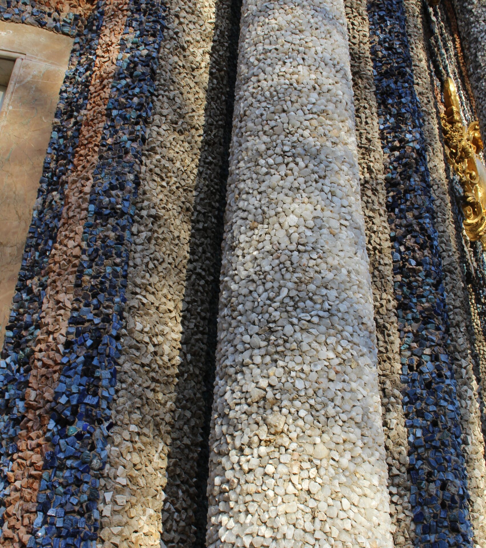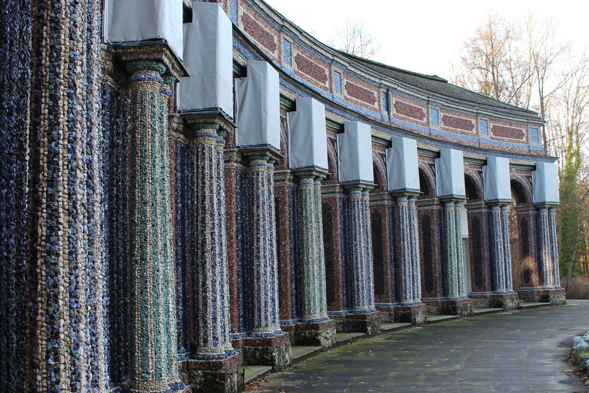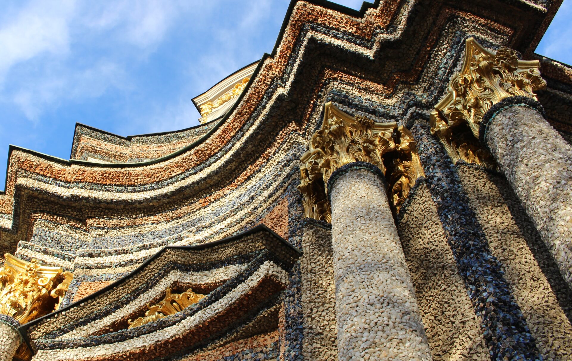 Wenn man vom Kanal her kommt sieht man schon von weitem die vergoldete Quadriga auf dem Dach des Sonnentempels, dem mittleren Teil des neuen Schlosses. Dessen beiden Seitenflügel bilden die Orangerie der Eremitage. Die Säulen der Orangerie sind über und über mit funkelnden Mineralsteinen in rot, blau, gelb und weiß bedeckt und leuchten in der Sonne.