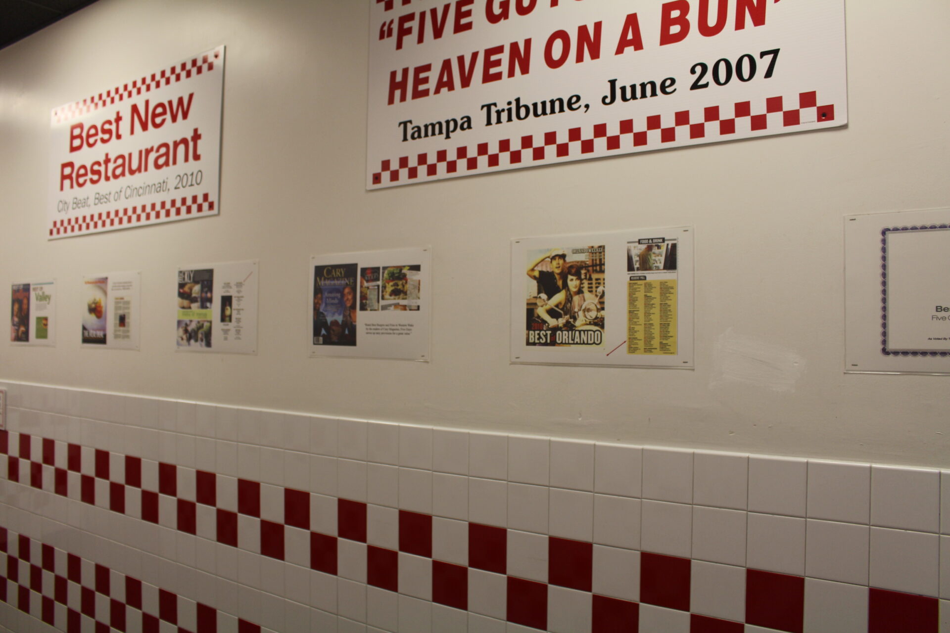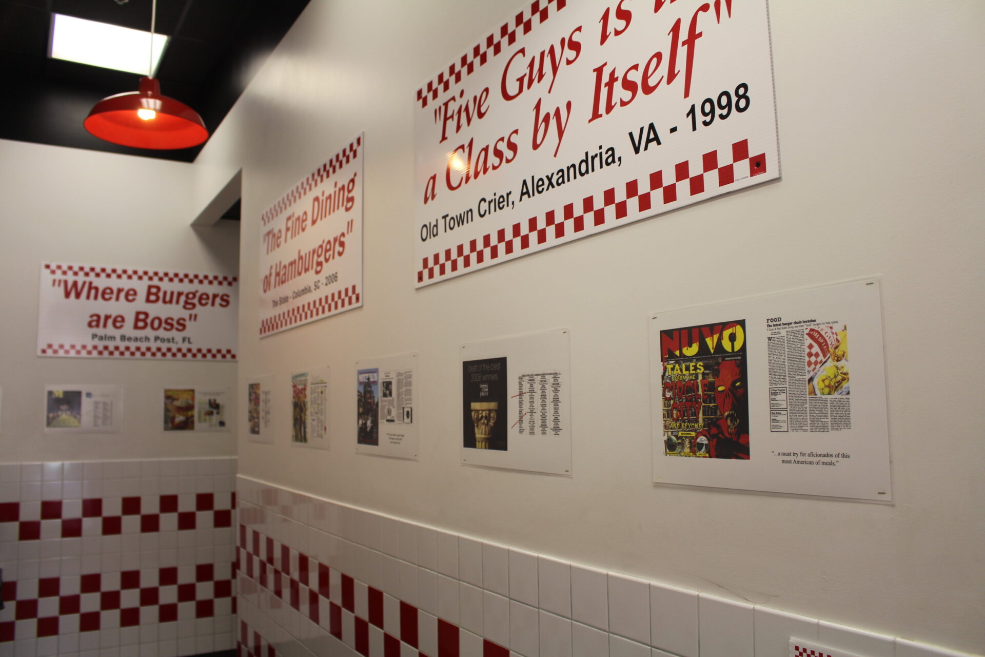 Auch, wenn ich das nüchterne Ambiente von Five Guys Burger anfangs etwas einfach fand, überraschte mich die Sauberkeit des Lokals und auch der Toiletten sehr. Auf dem Weg dorthin kann man viele Auszeichnungen an den Wänden sehen die Five Guys verliehen worden sind.