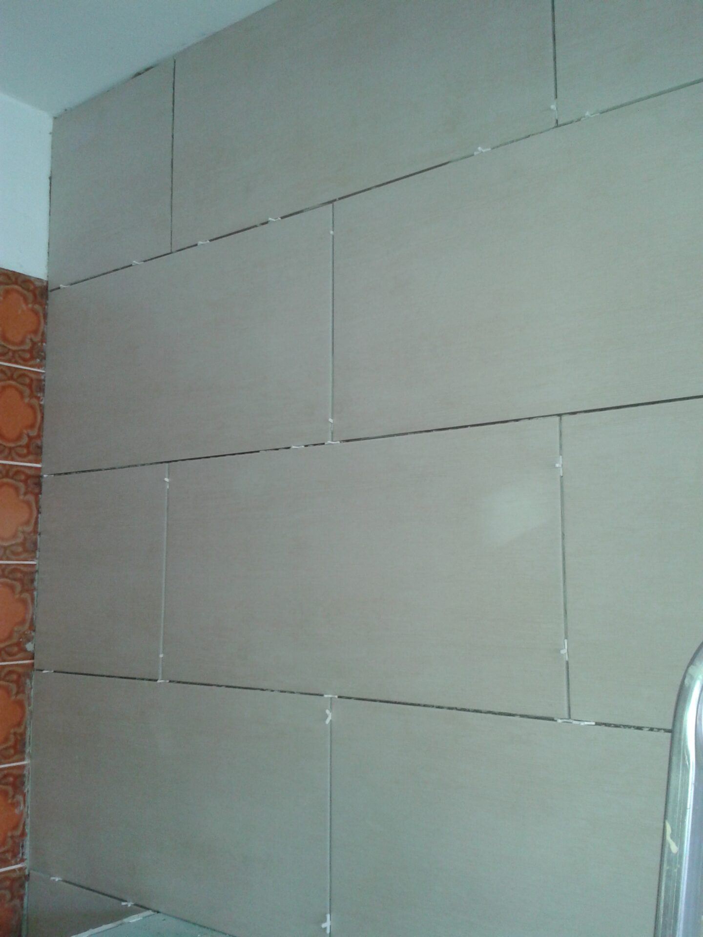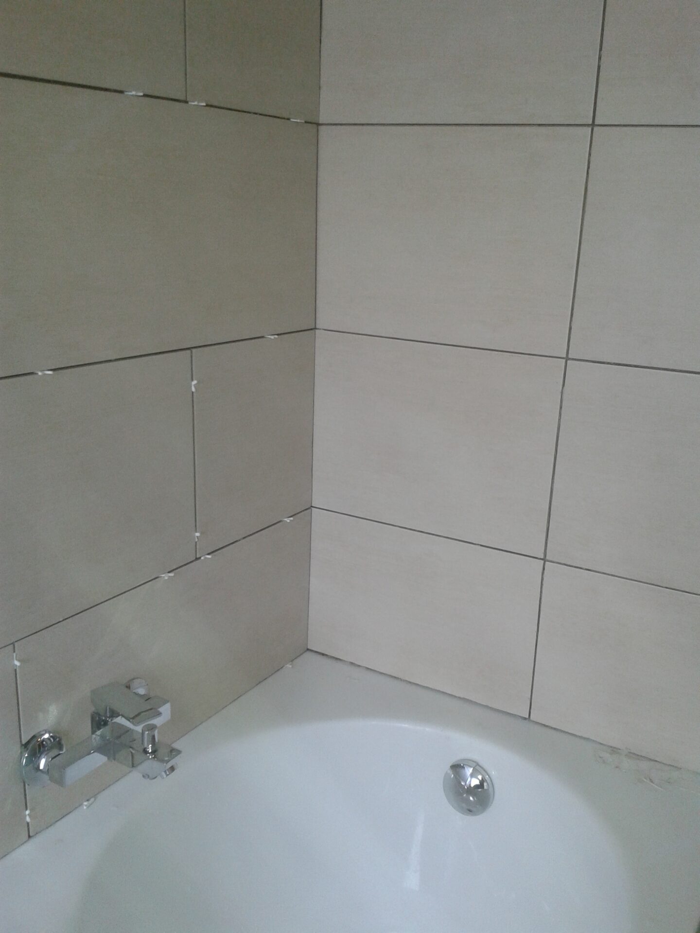 Nachdem der Untergrund eben und trocken war konnte ich den Fliesenkleber anrühren. Dafür habe ich einen Flexkleber verwendet. Dieser wurde von mir mit einem speziellen Rührer, den man an der Bohrmaschine anbringen kann, nach Angabe des Herstellers angerührt. Man sollte immer nur soviel Kleber vorbereiten, wie man gerade verarbeiten kann, denn er ist nur eine bestimmte Zeit verarbeitungsfähig. Es gibt aber auch schon fertigen Fliesenkleber den man sofort aus dem Eimer auftragen kann. Für einen sicheren Halt der neuen Fliesen, muss der alte Fliesenbelag mit einer dünnen Schicht Fliesenkleber abgespachtelt werden. Der Kleber wird mit einer Glättekelle glatt auf die Fläche aufgezogen. Dadurch werden auch die alten Fugen und schadhafte Stellen ausgeglichen. Anschließend wird der aufgetragene Fliesenkleber mit der Zahnkelle durchgekämmt. Will man Wände und Boden fliesen, sollte man erst die Wände machen. Plane vorher wie es hinterher aussehen soll. Natürlich darf man die Aussparungen für Steckdosen und Armaturen nicht vergessen. Diese haben uns Ärger bereitet, da wir Fliesen aus Feinsteinzeug hatten. Da Löcher rein bekommen war wirklich schwierig. Es gingen einige Bohrer kaputt, bis ich nach langer Suche bei Amazon auf diesen Diamantbohrer gestoßen bin. Den gibt es in verschiedenen Größen und es hat wirklich hervorragend funktioniert. Wir hatten große Fliesen die recht schwer waren. Deshalb haben wir sie von unten nach oben verarbeitet. Bei kleinen Fliesen kann man auch in der Mitte anfangen. Wir haben Fliesen in drei Farben verarbeitet. Beige für die Wände, Rotbraun für die Vorwandinstallation und einen Streifen der Wanne und Dunkelbraun für den Boden.