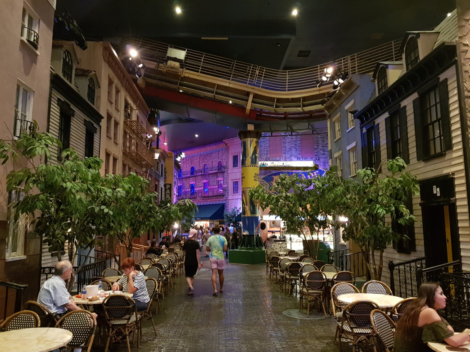 Das Angebot reicht von klassischer New Yorker Pizza über Sandwiches, Fisch, Hot Dogs, Pommes, bis hin zu frischen Backwaren aus der Village Bakery. Besonders spektakulär ist der Blick auf die Achterbahn, die sich durch das Hotel schlängelt.