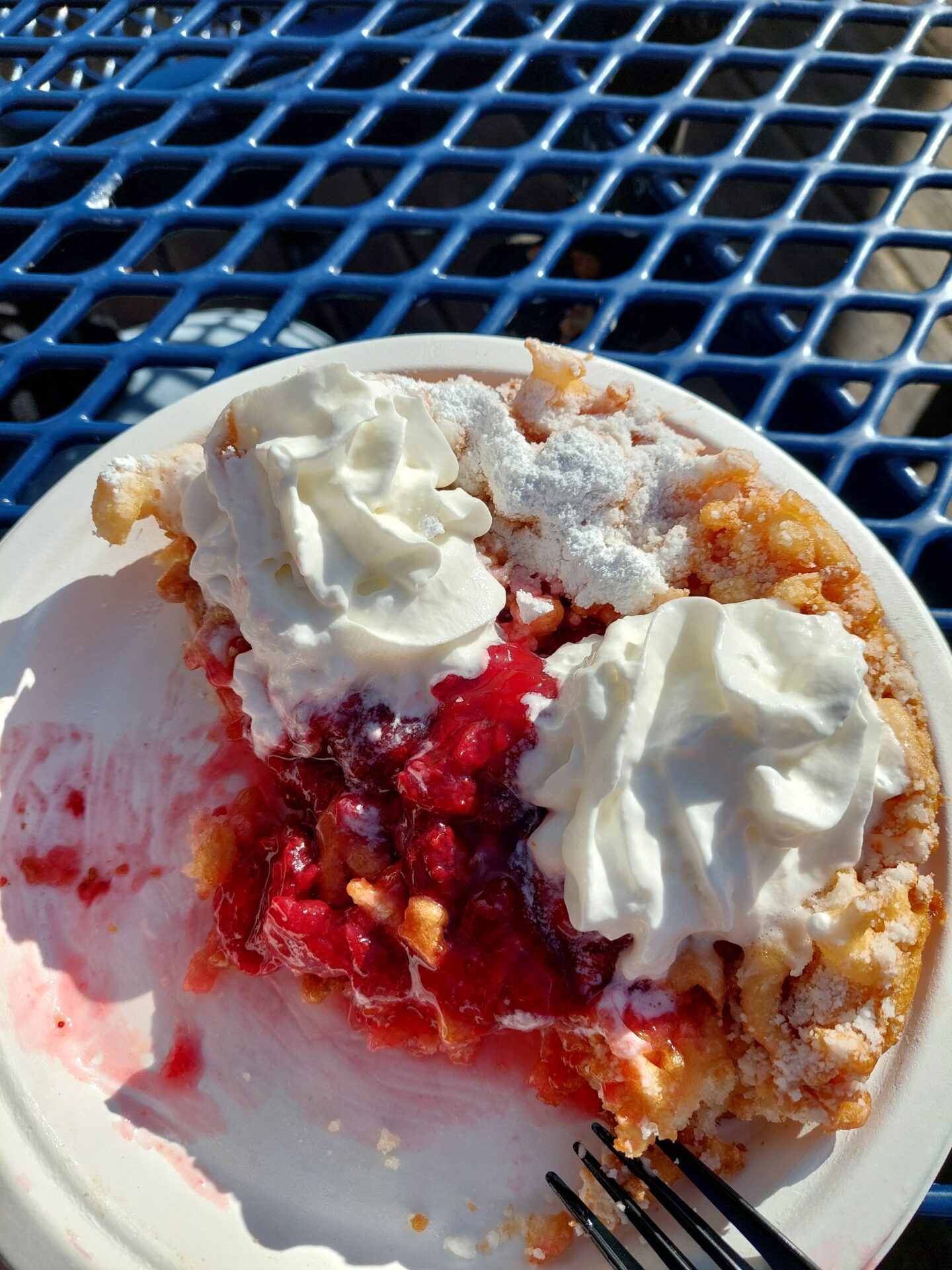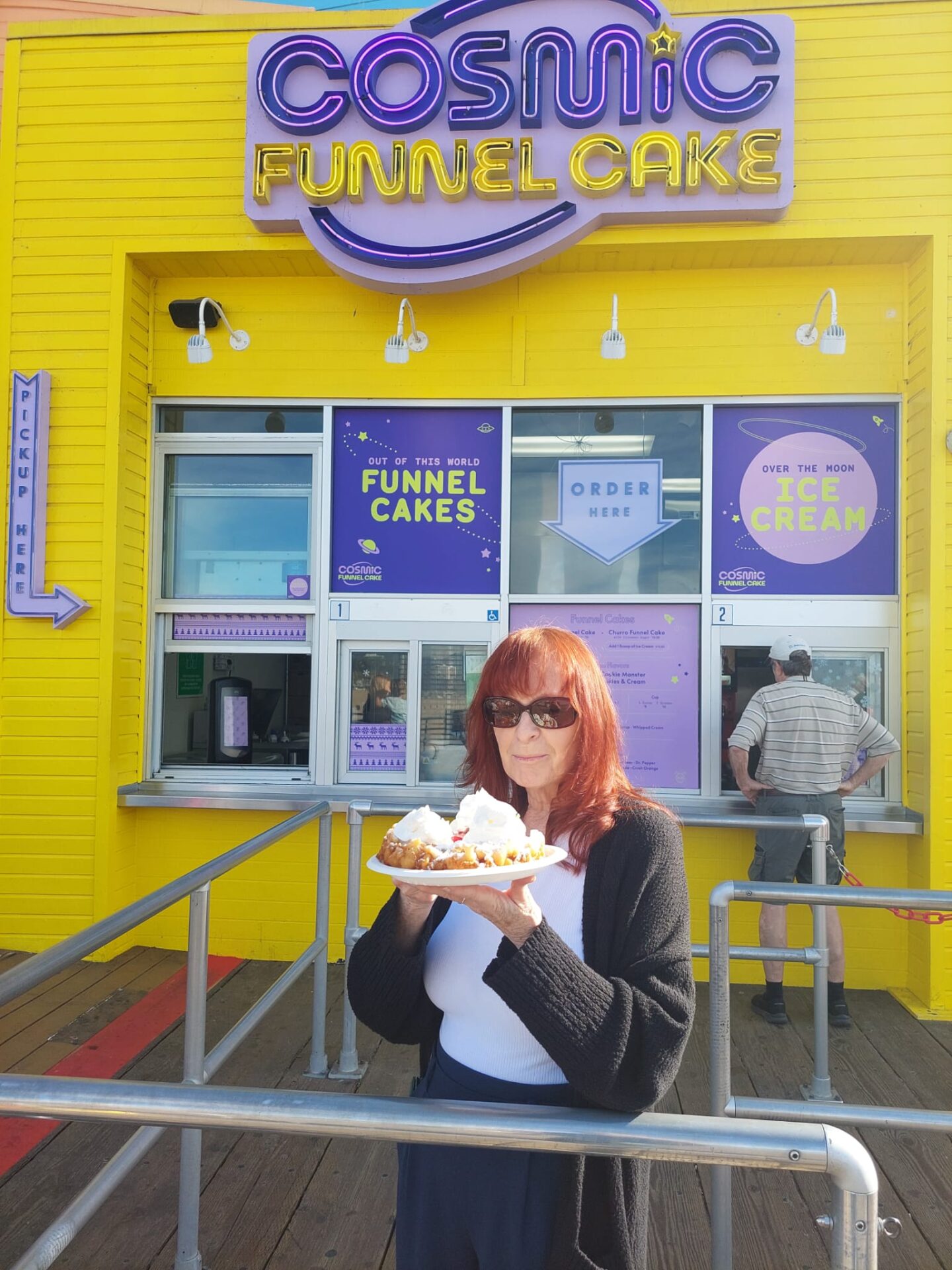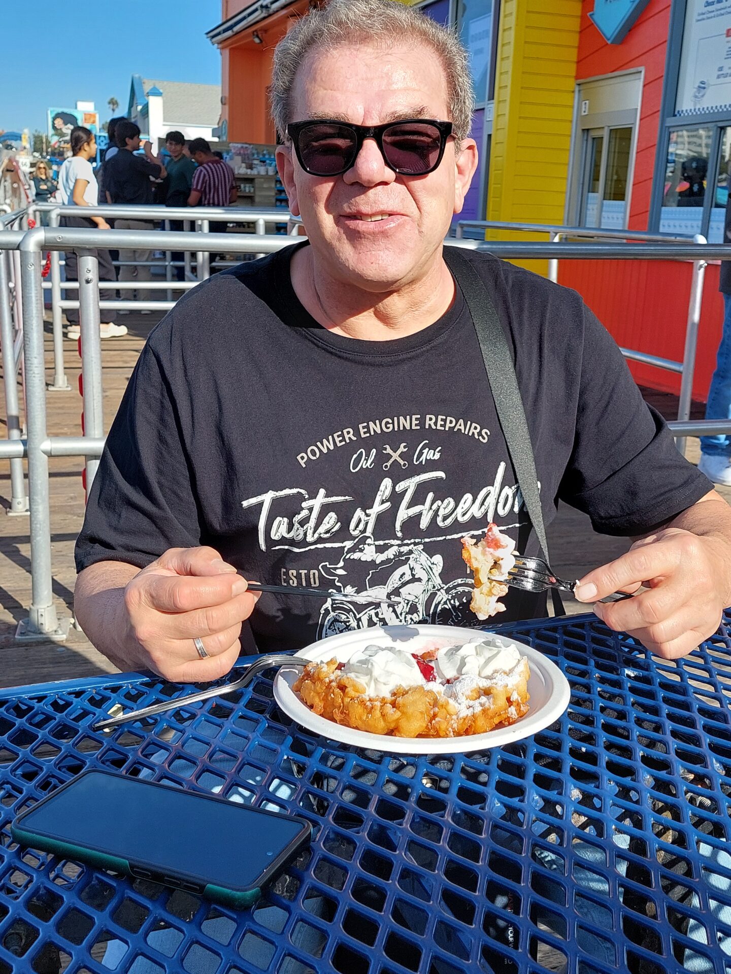 Mein persönlicher Favorit: Funnel Cake mit Erdbeeren und Sahne – ein echter Genuss, der sofort Erinnerungen an sonnige Tage am Santa Monica Pier weckt.