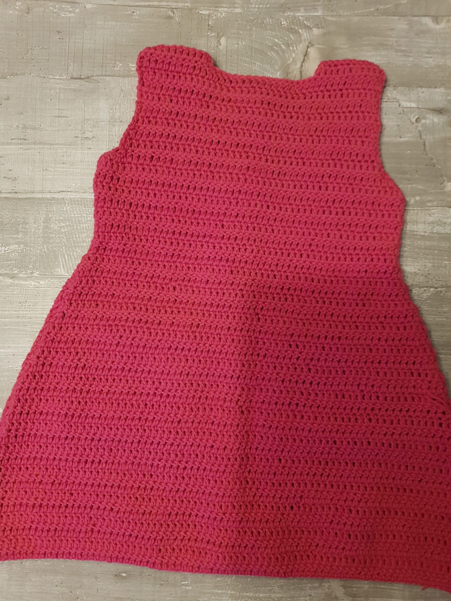 Für die Armschrägung auf jeder Seite 3x 2 Stäbchen abmaschen und dann gerade weiterhäkeln, bis eine Länge von 46 cm erreicht ist. Nun für den Halsausschnitt die mittleren 20 Stäbchen einfach liegen lassen und die beiden Seiten getrennt noch 2 cm hoch häkeln, Faden durchziehen und fertig ist das Rückenteil.