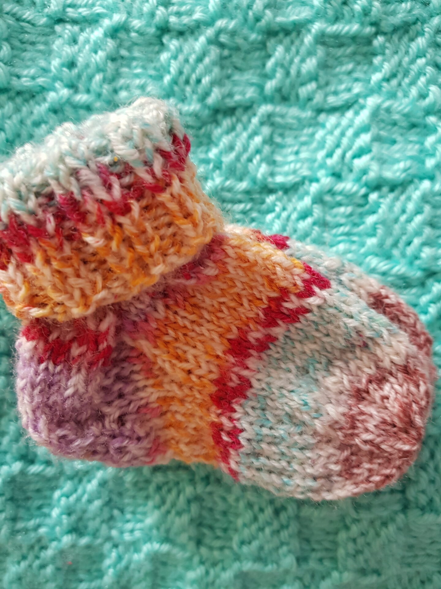 Da ich fleißige Sockenstrickerin bin, habe ich viele Reste von Sockenwolle in allen Farben übrig. Diese eignet sich sehr gut für kleine Babyfüßchen, da sie sehr angenehm zu tragen ist, strapazierfähig und in der Waschmaschine waschbar. Bei Sockenwolle muss man sich auch keine Gedanken über das Muster machen. Durch die verschieden ineinander gehenden Farben entsteht von selbst ein schönes Muster, so kann man einfach drauflos stricken, ohne sich viel Gedanken machen zu müssen.