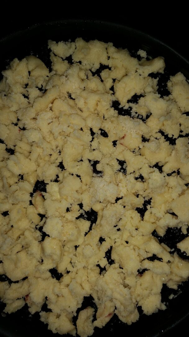 Alls erstes die Zutaten (Zucker, Butter, Mehl) für die Streusel miteinander verkneten, denn diese müssen bis sie gebraucht werden in den Kühlschrank gestellt werden.