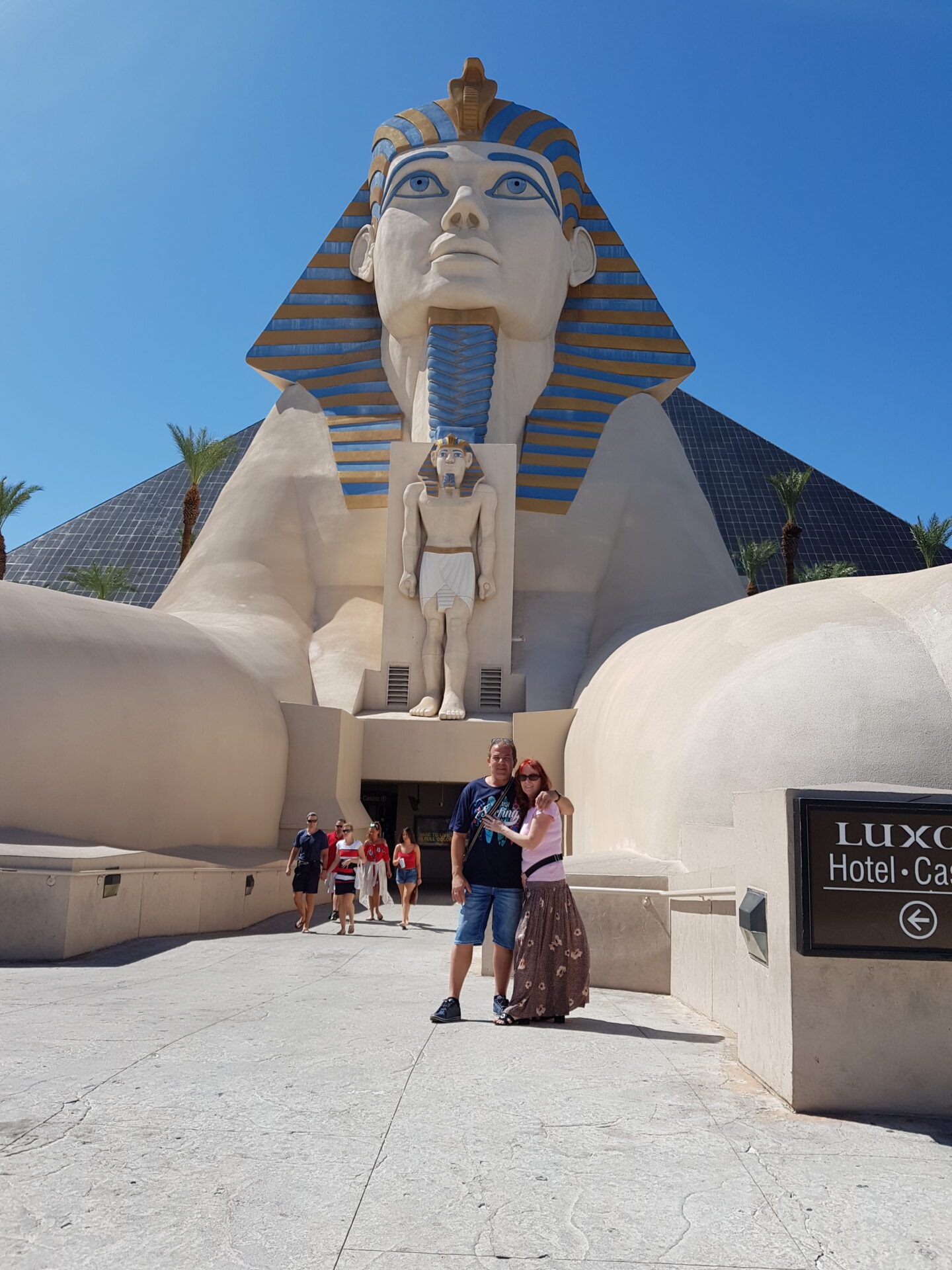 Die beeindruckende Pyramide des im ägyptischen Stil gebauten Hotels ist komplett schwarz verglast und spiegelt sich im strahlenden Sonnenlicht. Davor befindet sich eine riesige Sphinx, die eine großartige Kulisse für ein Foto darstellt.