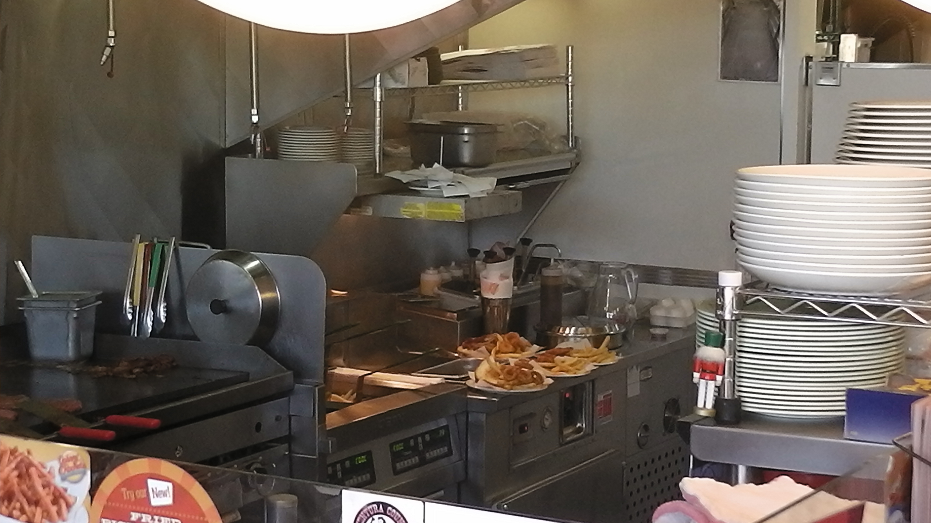 Auch hier ist die Location wieder perfekt im 50er Jahre Stil durchgestylt. Der Service ist sehr freundlich. Mein kleiner Enkel bekam ein lachendes Smilie aus Ketchup, auf einem kleinen weißen Teller, zu seinen Pommes. Man bekommt auch Unlimited Fries, Pommes Nachschlag so oft man will! Auch die Cheese Fries und die Onion Rings sind sehr empfehlenswert. Die Preise sind zwar etwas höher als in andern Fast Food Restaurants, aber das ist es uns auch wert, da die Atmosphäre stimmt und das Personal dort sehr nett und aufmerksam ist. Es ist ein angenehmer Platz zum Erholen von der anstrengenden Tour über den Hollywood Boulevard.
