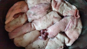 Mit einem scharfen Messer entferne ich erst vorsichtig den Knochen. Dann lege ich die ausgelösten Gänsebrüste mit der Hautseite auf ein Brett und schneide sie an der Stelle, wo vorher der Mittelknochen war, der Länge nach durch. Die nun 12 Gänsebrüste werden von beiden Seiten gut mit Salz und Pfeffer eingerieben.