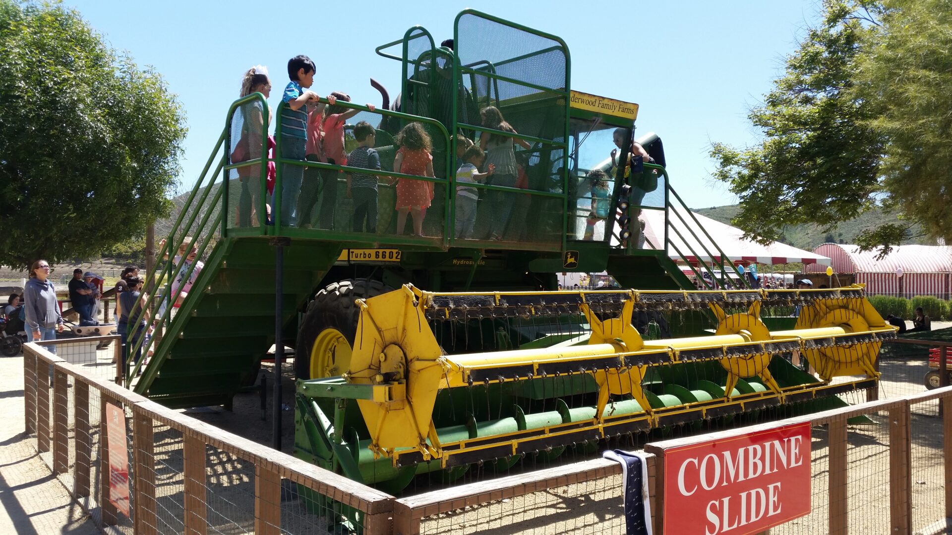 Er wollte lieber zu der Holzbahn die von einem Traktor gezogen wurde und auf den Mähdrescher von dem aus man mit einer Rutsche wieder nach unten kam. Auch auf die Heu-Pyramide wollte er klettern und natürlich mit einem Elektrotraktor fahren.