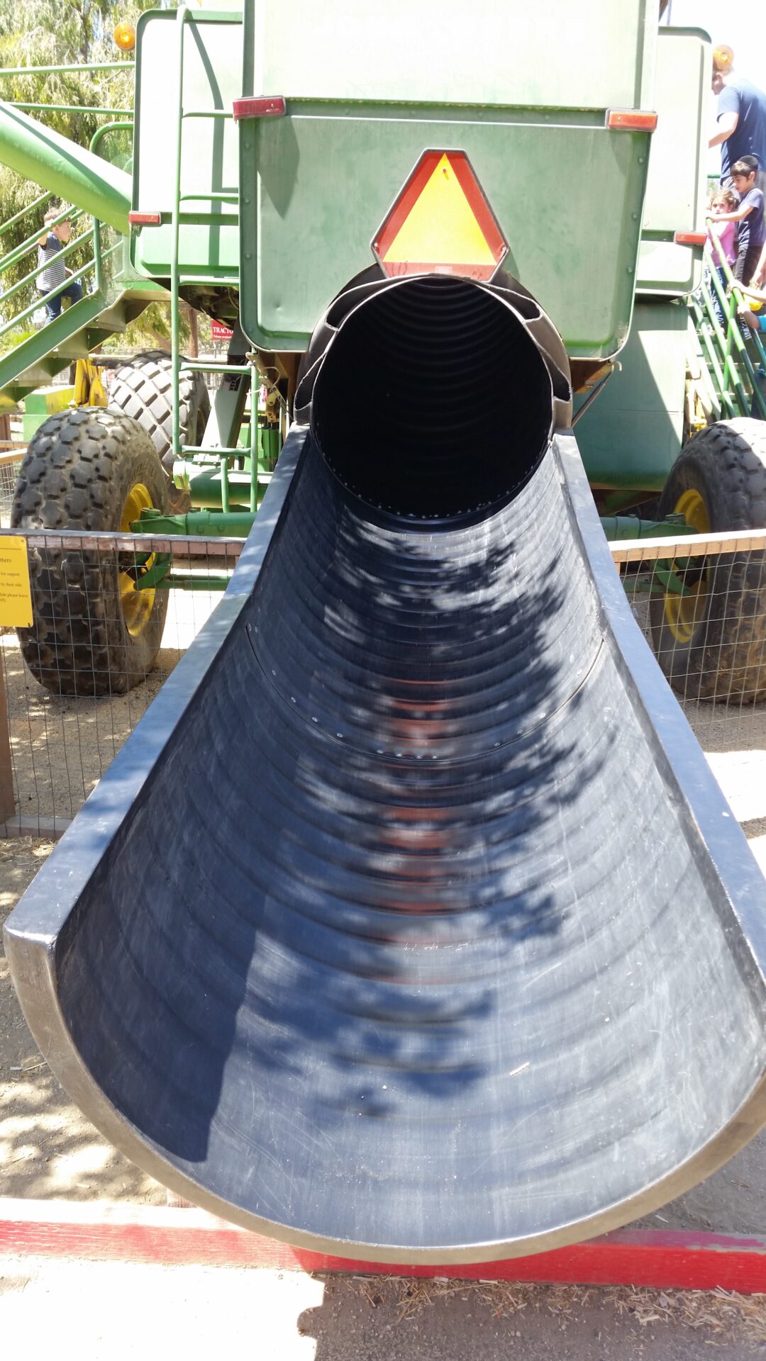 Er wollte lieber zu der Holzbahn die von einem Traktor gezogen wurde und auf den Mähdrescher von dem aus man mit einer Rutsche wieder nach unten kam. Auch auf die Heu-Pyramide wollte er klettern und natürlich mit einem Elektrotraktor fahren.