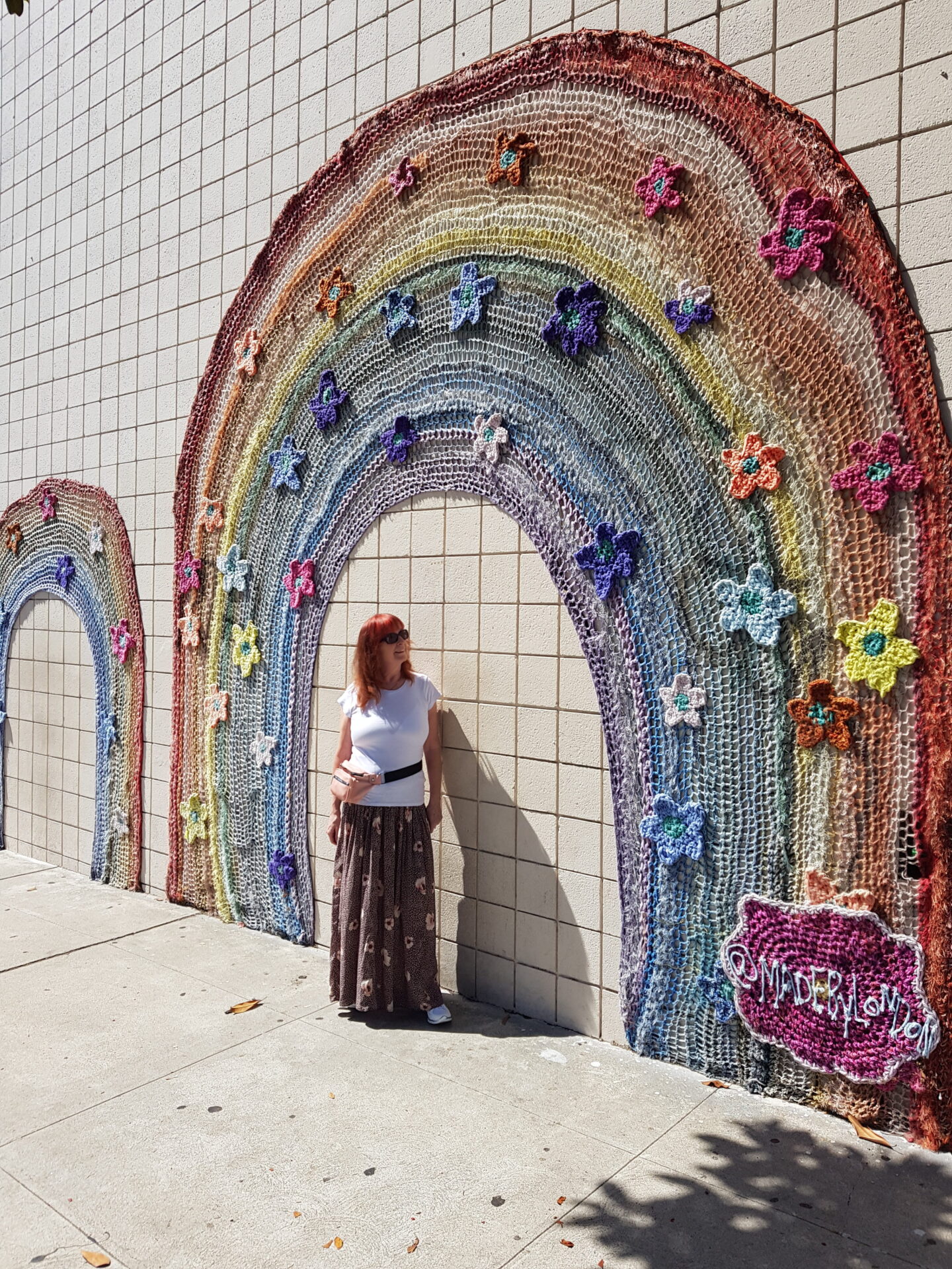 An der südwestlichen Ecke von Melrose Ave und Laurel, direkt gegenüber der Wand von Made In LA sieht man zwei bunte Regenbogen an der Wand. Wenn man näher kommt sieht man das diese Bogen nicht aufgemalt, sondern gehäkelt sind. Ich fand die Wand total süß mit ihren Farben und den Blümchen und wollte natürlich unbedingt ein Foto.