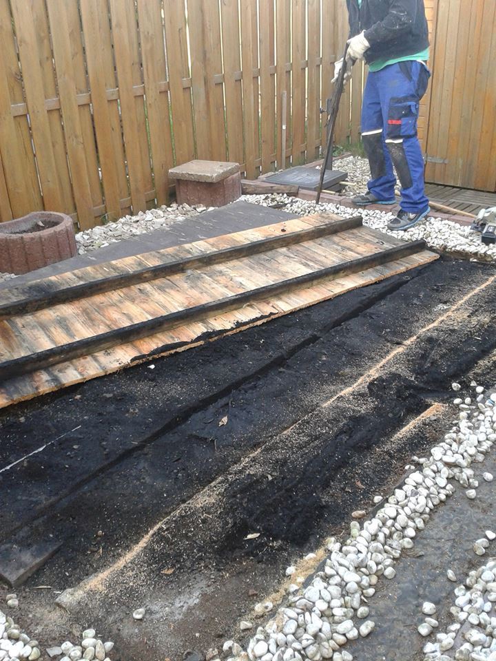 Erst einmal musste alles Alte raus und entsorgt werden, um die neue Holzterrasse zu bauen. Wir hatten uns für Terrassendielen entschieden, für diese musste aber natürlich erst der richtige Untergrund geschaffen werden.
