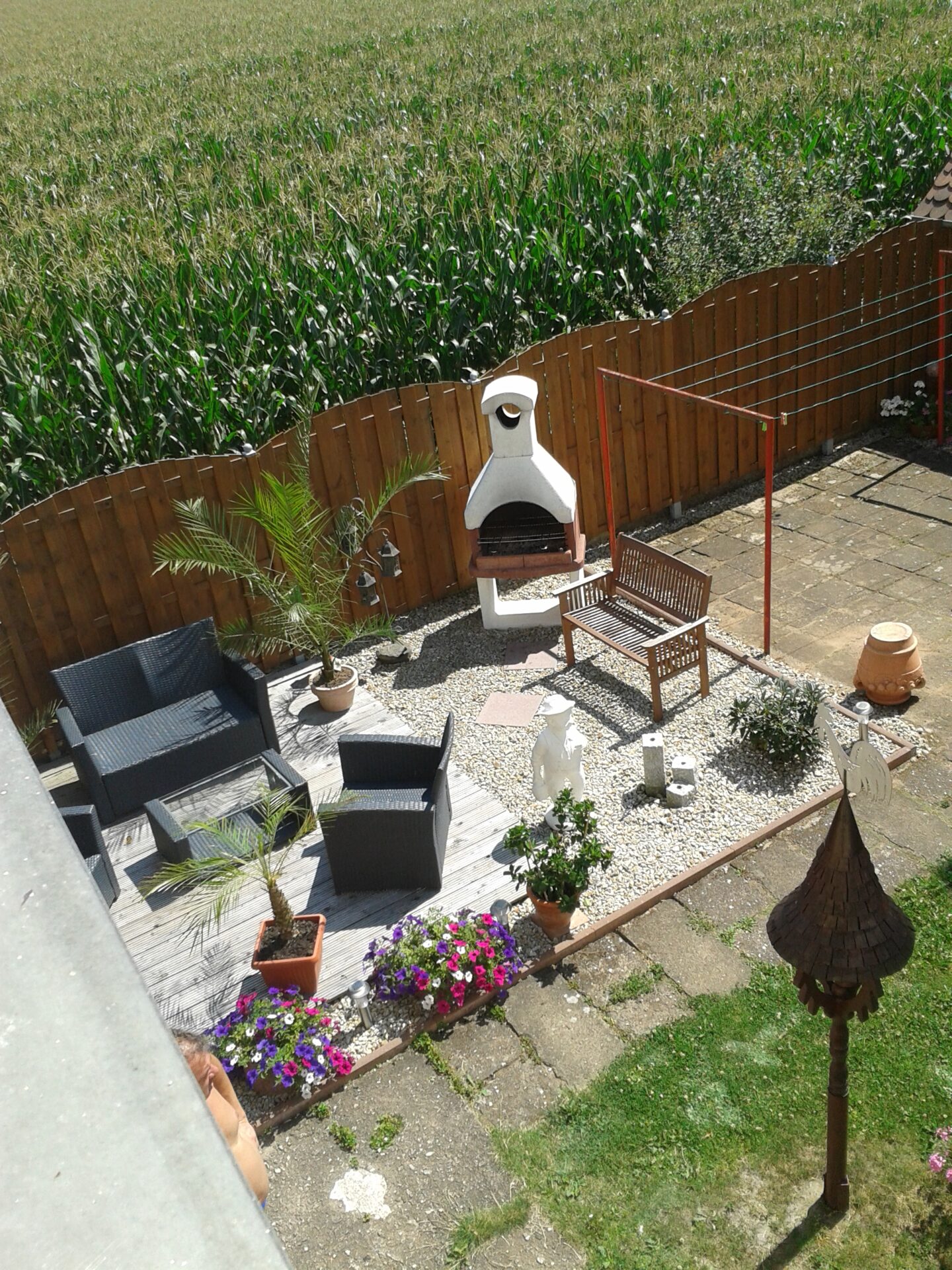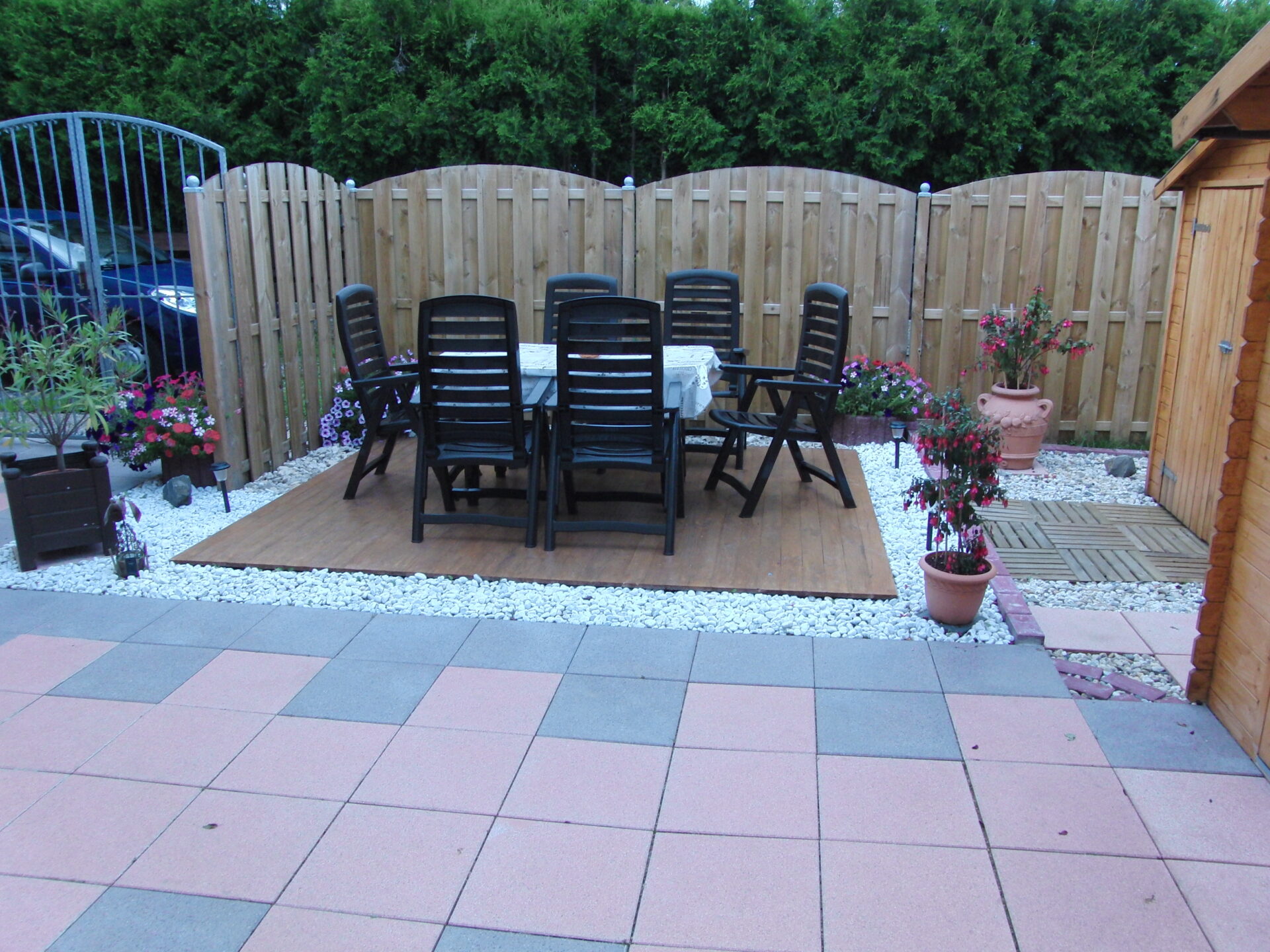 Auf die gleiche Weise haben wir dann gleich noch eine weitere Terrasse in unserem Garten gebaut. Unser Wäscheplatz hatte es auch dringend nötig, die alten Betonfliesen gefielen uns nicht mehr. Dort war es natürlich viel einfacher, da wir darauf gleich das Holzgerüst befestigen konnten und die neue Terrasse schnell fertig war.