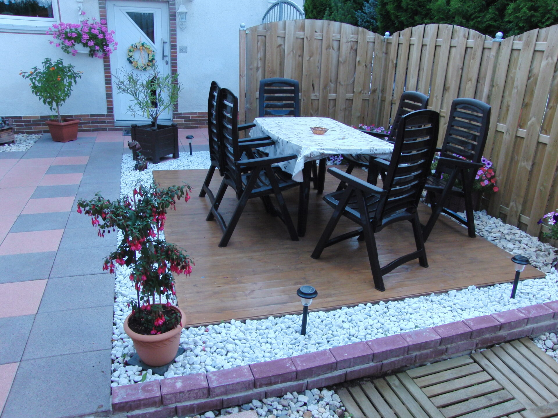 Normalerweise hätten wir noch die Kanten verblendetn müssen, aber da wir noch eine LED-Lichtleiste anbringen wollten, haben wir darauf verzichtet. Die Dielen wurden mit Zierkiesel umrandet und die Dielen noch mit einer extra dafür bestimmten Holzschutzlasur gestrichen. Dann haben wir unsere neu gekauften, schicken Gartenmöbel darauf gestellt und fertig war die neue Holzterrasse.