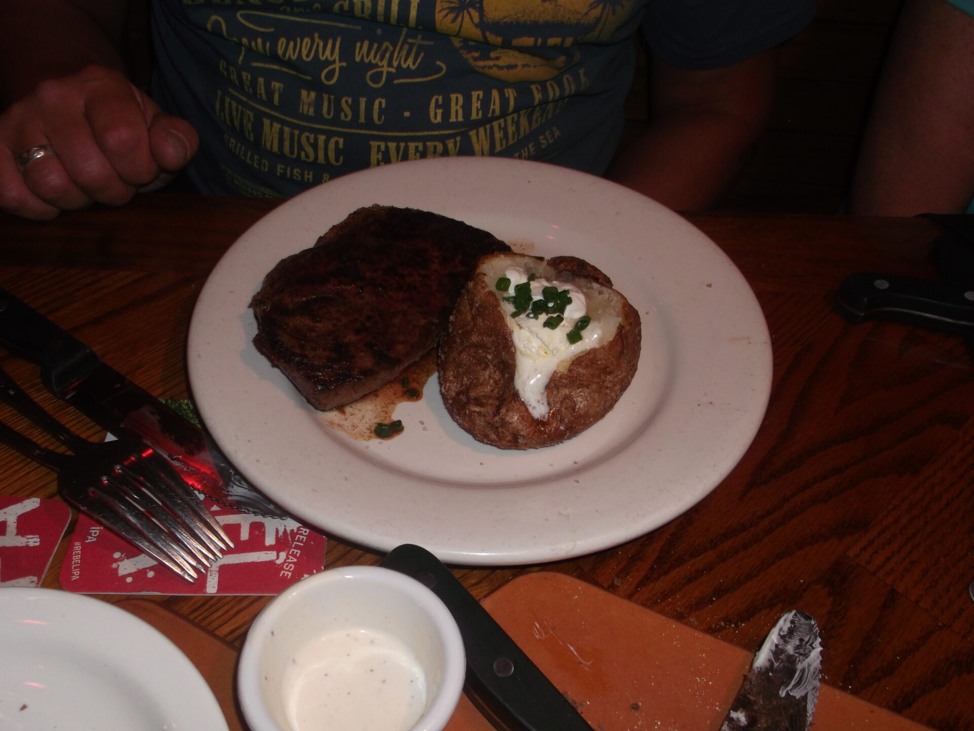 Wir hatten ein leckeres Ribeye Steak, gut marmoriert, saftig und lecker und als Beilage eine große Ofenkartoffel mit einer Sauce aus saurer Sahne, Butter, Schnittlauch und Speck.