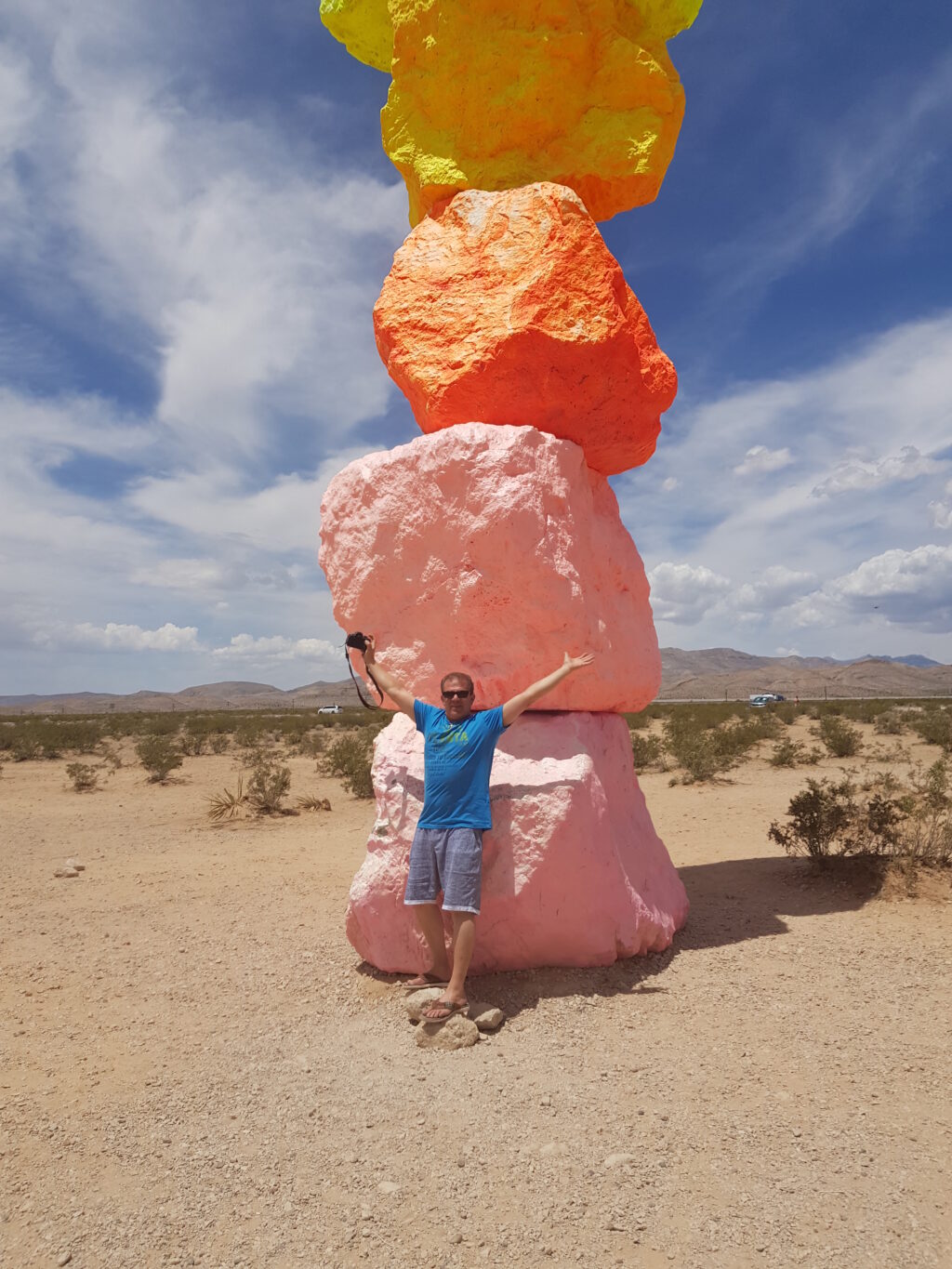 Schon oft hatten wir Bilder von diesen farbenfrohen Felsbrocken mitten in der Wüste gesehen – und diesmal wollten wir die Seven Magic Mountains endlich mit eigenen Augen bestaunen. Dieses beeindruckende Kunstwerk des Schweizer Künstlers Ugo Rondinone gilt als ein echtes Muss bei einem Besuch in Las Vegas. Da die Ausstellung ursprünglich nur bis 2018 bestehen sollte, wollten wir die Gelegenheit unbedingt nutzen. Wer weiß, ob sie bei unserem nächsten Trip noch da wären?