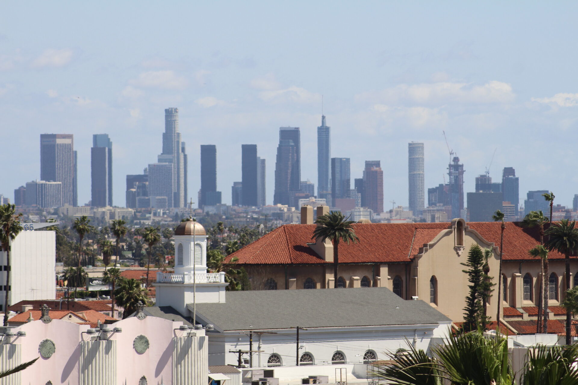 Auf der obersten Terrasse sollte man sich etwas vom Trubel entfernen und an die Mauer ganz an den Rand gehen. Ganz unerwartet, bietet sich einem ein einmaliger Blick auf die Skyline von L A und auf den Walk of Fame.