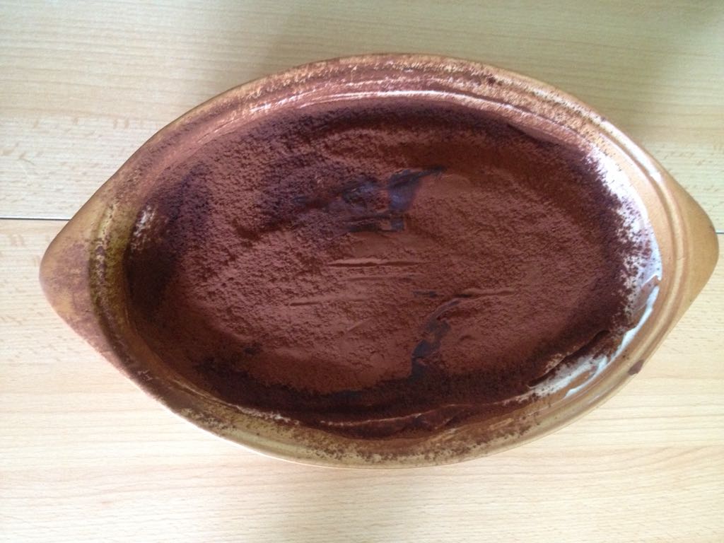 Eine Lage Creme darübergeben und den Vorgang ein zweites Mal wiederholen. Danach für mindestens vier Stunden – besser über Nacht – in den Kühlschrank stellen. Vor dem Servieren mit Kakaopulver bestäuben.