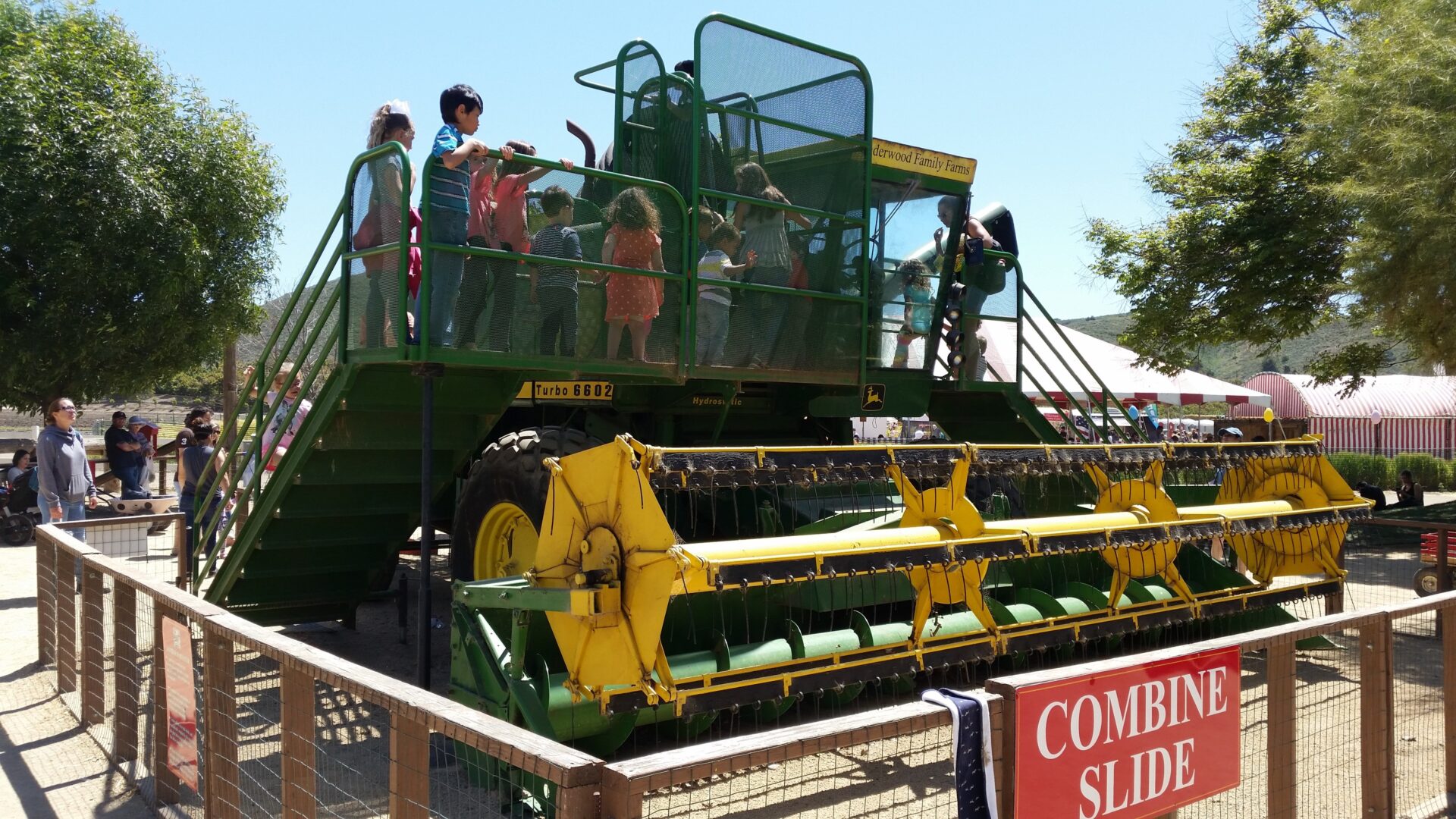 Danach wollte unser Enkel zu der Holzbahn, die von einem Traktor gezogen wurde und auf den Mähdrescher, von dem aus man mit einer Rutsche wieder nach unten kam. Auch auf die Heupyramide wollte er klettern und natürlich mit einem Elektrotraktor fahren.