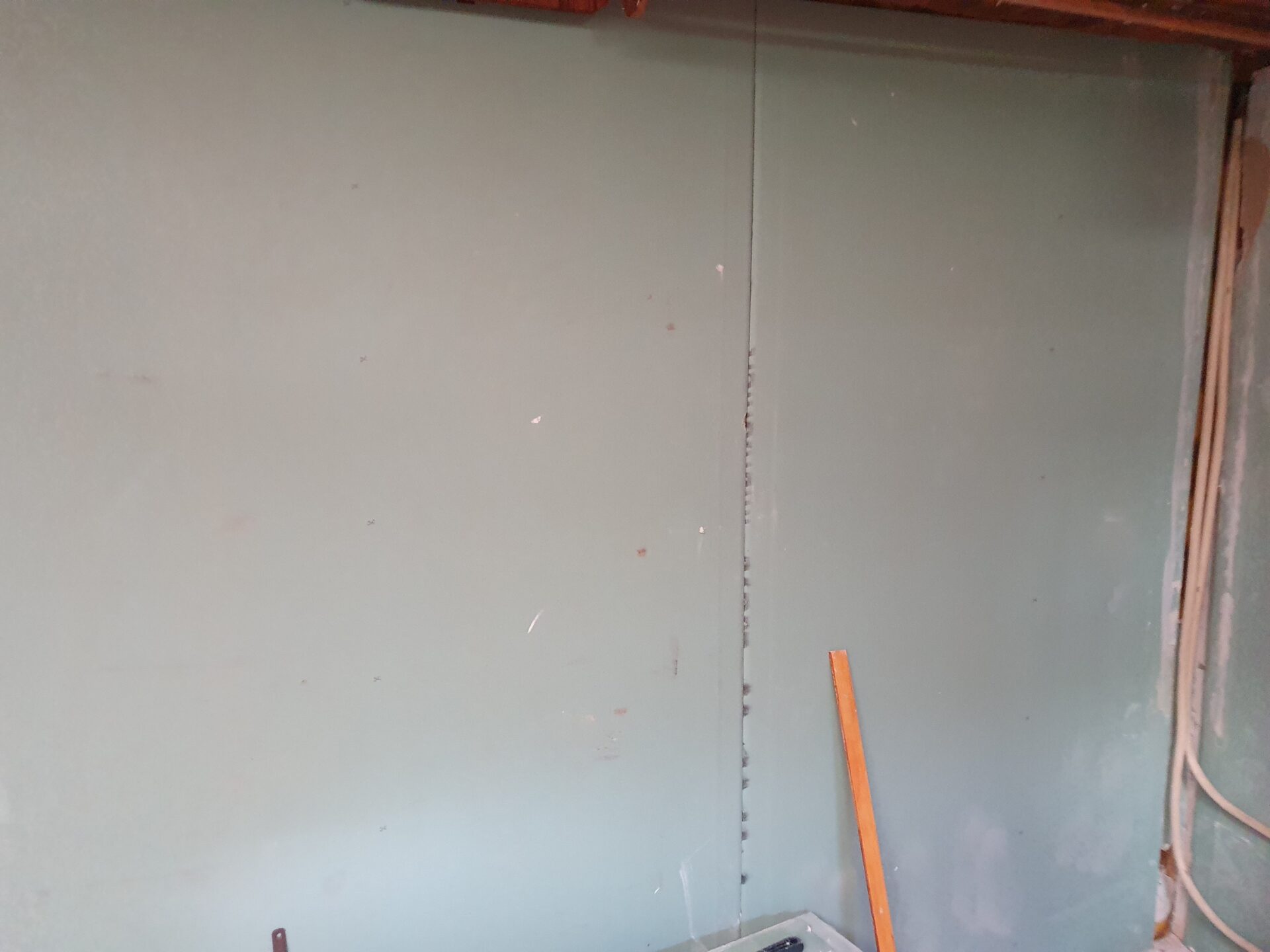 Als Erstes wurde neuer Putz aufgetragen, der dann natürlich auch erst austrocknen musste. Es dauerte wieder einige Zeit, bis wir das Lattengerüst für die Rigipsplatten endlich an den Wänden befestigen und danach die Platten anschrauben konnten.