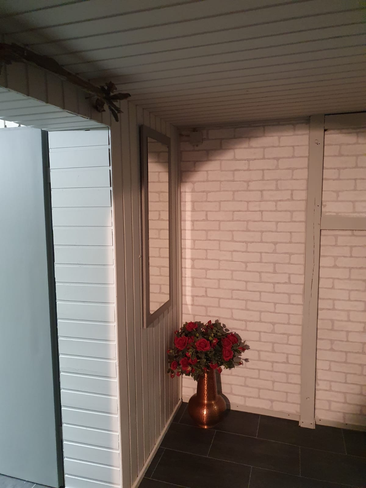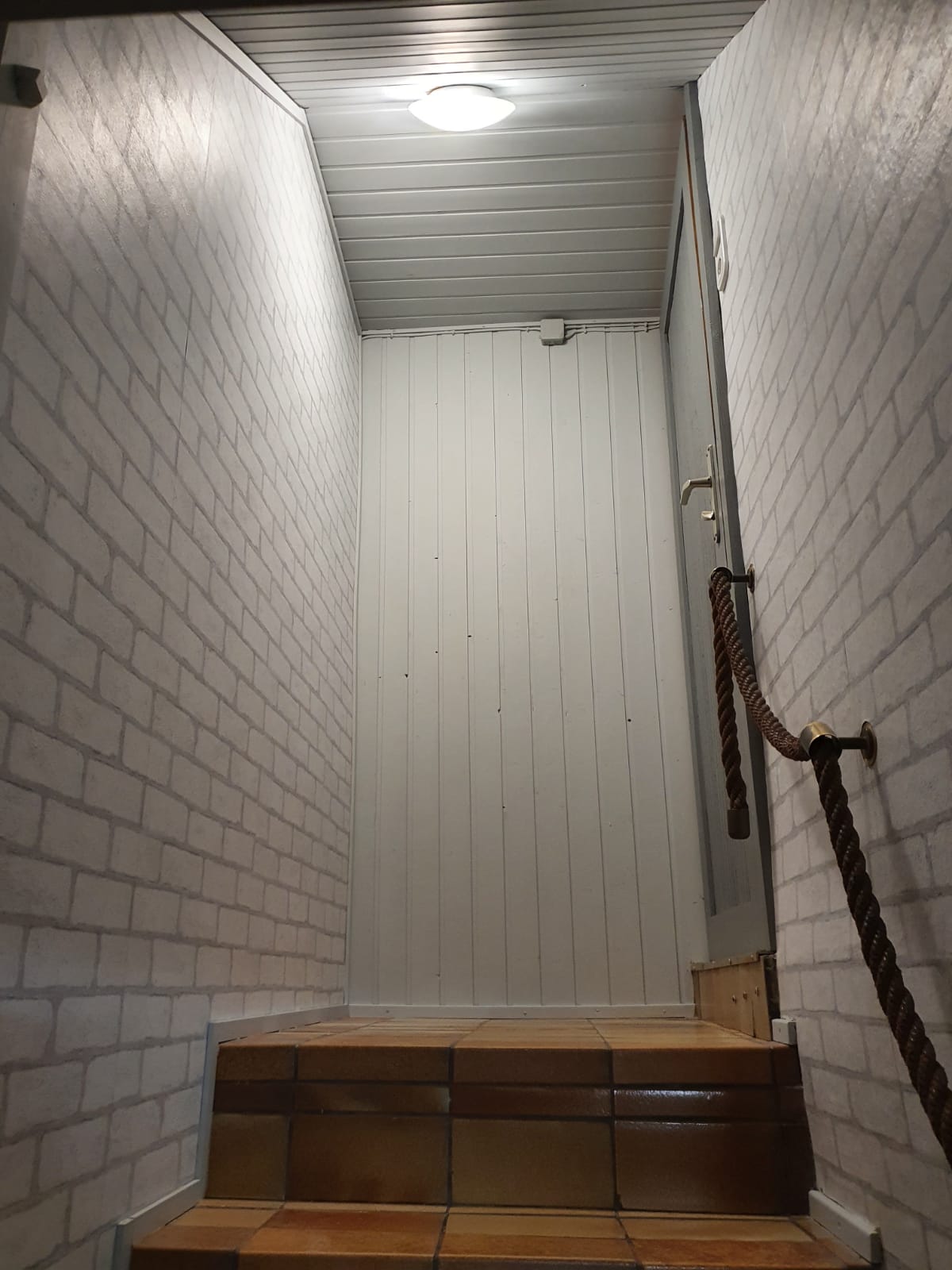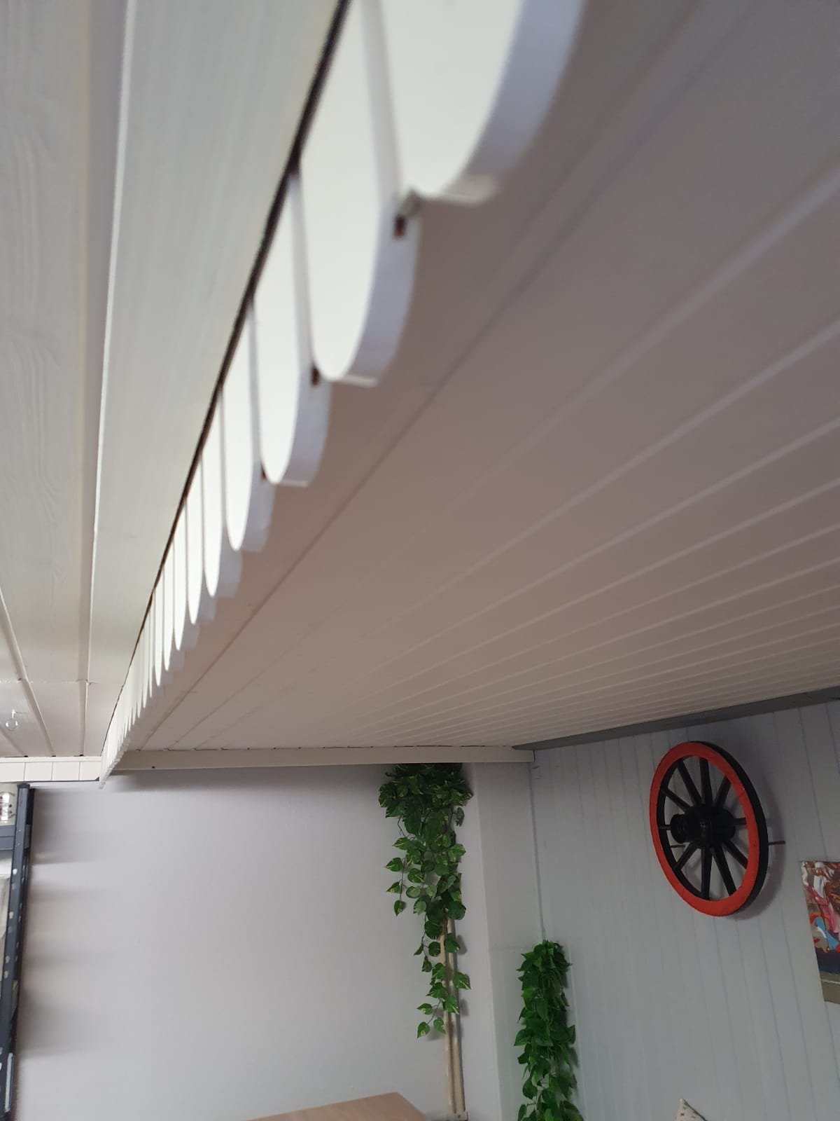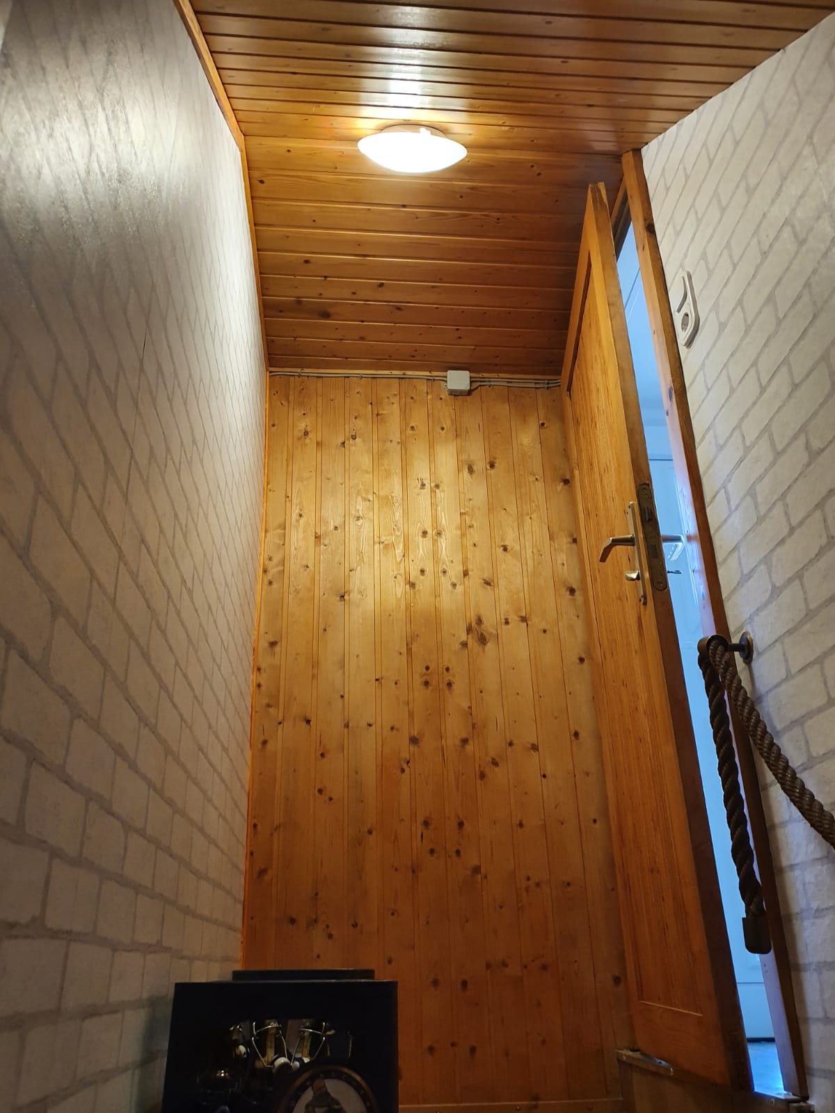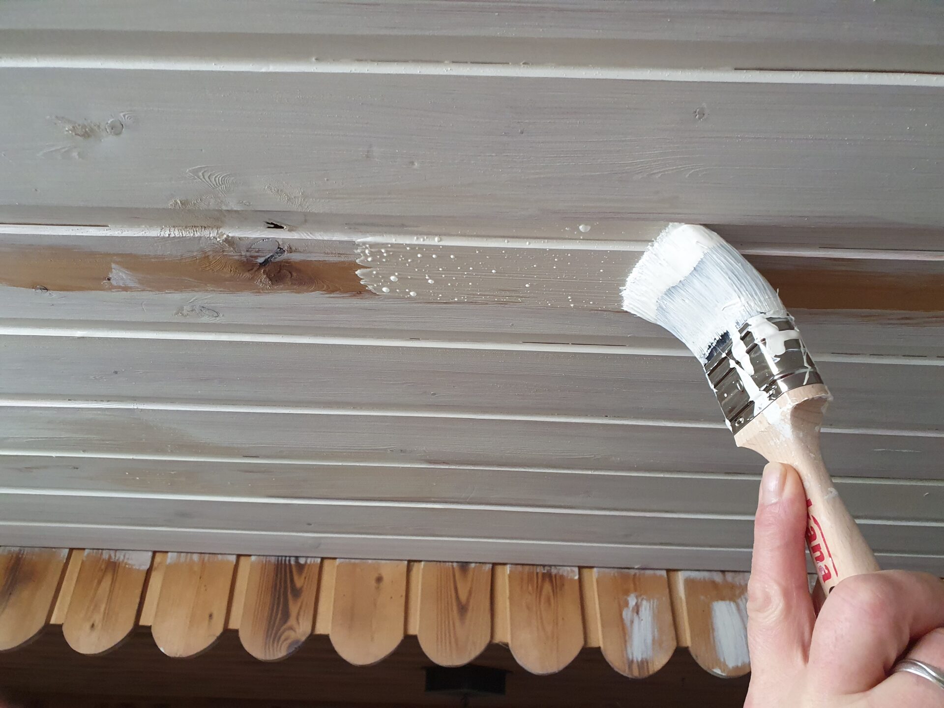 In der Trockenzeit wurden die verbliebene Holzdecke und eine Holzwand, die vom Wasserschaden verschont geblieben sind, bearbeitet. Sie bekamen einen Anstrich mit der gleichen Farbe wie der Eingangsbereich.