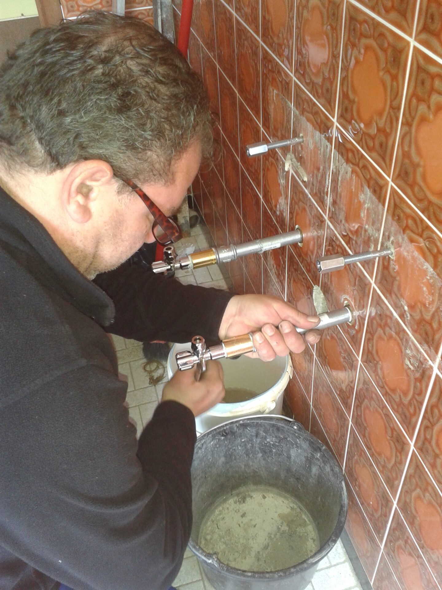Es mußte alles gut isoliert werden, damit wir später kein Wasserproblem haben. Das Außengewinde wurde mit einer groben Metallfeile angeritzt damit das Dichtungsband sich nicht verschiebt,es muss am Gewinde haften bleiben. Dann wurde es mit Fermit bestrichen und mit Dichtungsband umwickelt. Danach wurde das Gegenstück mit der Hand aufgeschraubt und mit Rohrzange und Schraubenschlüssel festgezogen. Als nächstes mussten die alten Wasseranschlüsse mit den Gewindeverlängerungen verbunden werden. Auf diese wurden dann die Gewindeverbindungen aus Messing geschraubt. Dann haben wir etwas zum Wasser auffangen für den Notfall darunter gestellt und bis nächsten Morgen gewartet um zu sehen ob alles dicht ist oder ob irgendwo Wasser durch kommt.